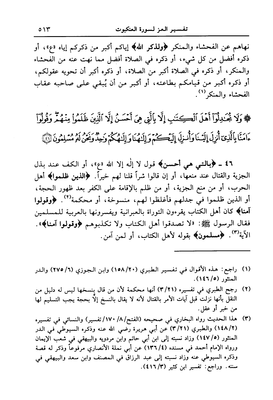 نهاهم عن الفحشاء والمنكر {وَلَذِكْرُ اللَّهِ} إياكم أكبر من ذكركم إياه " ع "، أو ذكره أفضل من كل شيء، أو ذكره في الصلاة أفضل مما نهت عنه من الفحشاء والمنكر، أو ذكره في الصلاة أكبر من الصلاة، أو ذكره أكبر أن تحويه عقولكم، أو ذكره أكبر من قيامكم بطاعته، أو أكبر من أن يُبقي على صاحبه عقاب الفحشاء والمنكر. {ولا تجادلوا أهل الكتاب إلا بالتي هي أحسن إلا الذين ظلموا منهم وقولوا ءامنا بالذي أنزل إلينا وأنزل إليكم وإلهنا وإلاهكم واحدٌ ونحن له مسلمون
