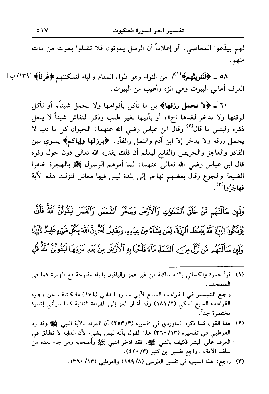 58 - {لنثوينهم} / [139 / ب] من الثواء وهو طول المقام والباء لنسكننهم {غرقا} الغرف أعالي البيوت وهي أنزه وأطيب من البيوت.