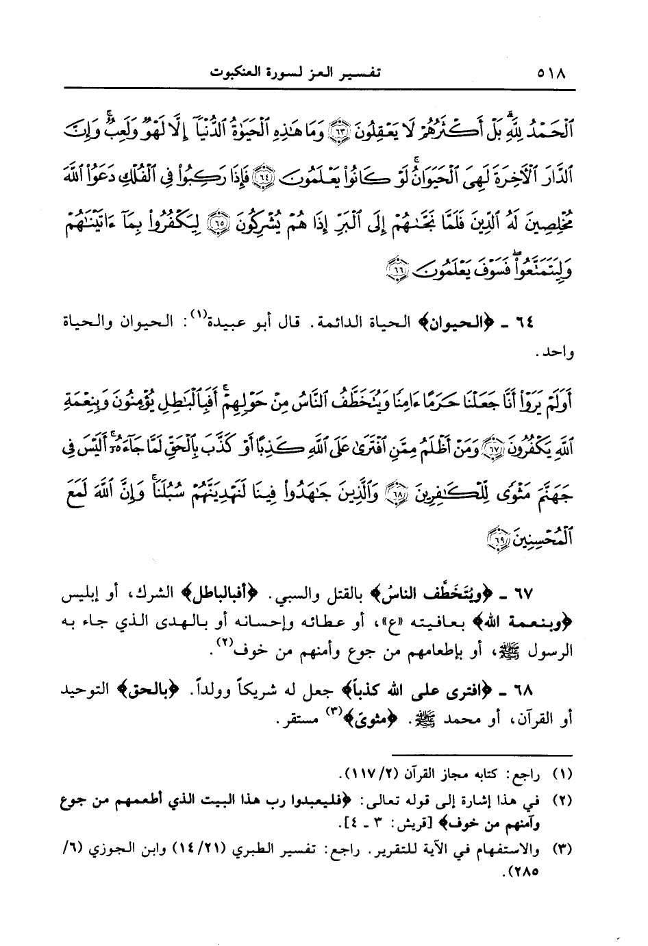 64 - {الحيوان} الحياة الدائمة. قال أبو عبيدة: الحيوان والحياة واحد. {أو لم يروا أنّا جعلنا حرماً ءامناً ويتخطف الناس من حولهم أفبالباطل يؤمنون وبنعمة الله يكفرون 67 ومن أظلم ممن أفترى على الله كذباً أو كذب بالحق لما جاءه أليس في جهنم مثوىً للكافرين والذين جاهدوا فينا لنهدينّهم سبلنا وإن الله لمع المحسنين}