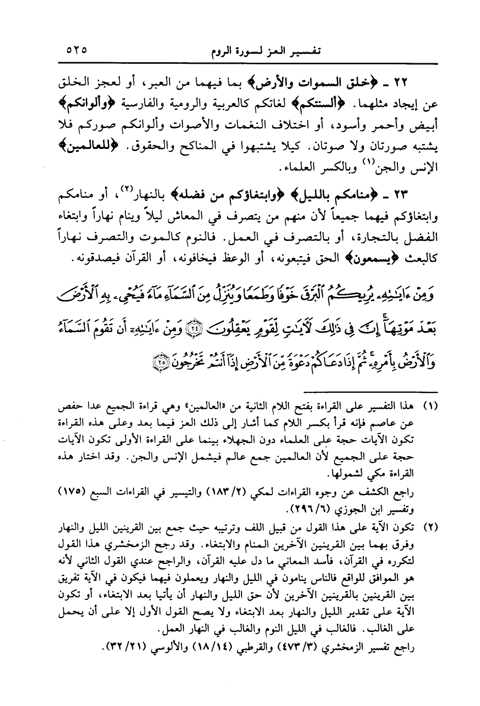 22 - {خَلْقُ السَّمَاوَاتِ وَالأَرْضِ} بما فيهما من العبر، أو لعجز الخلق عن إيجاد مثلهما. {أَلْسِنَتِكُمْ} لغاتكم كالعربية والرومية والفارسية {وَأَلْوَانِكُمْ} أبيض وأحمر وأسود، أو اختلاف النغمات والأصوات وألوانكم صوركم فلا يشتبه صورتان ولا صوتان. كيلا يشتبهوا في المناكح والحقوق. {لِّلْعَالِمِينَ} الإنس والجن وبالكسر العلماء.