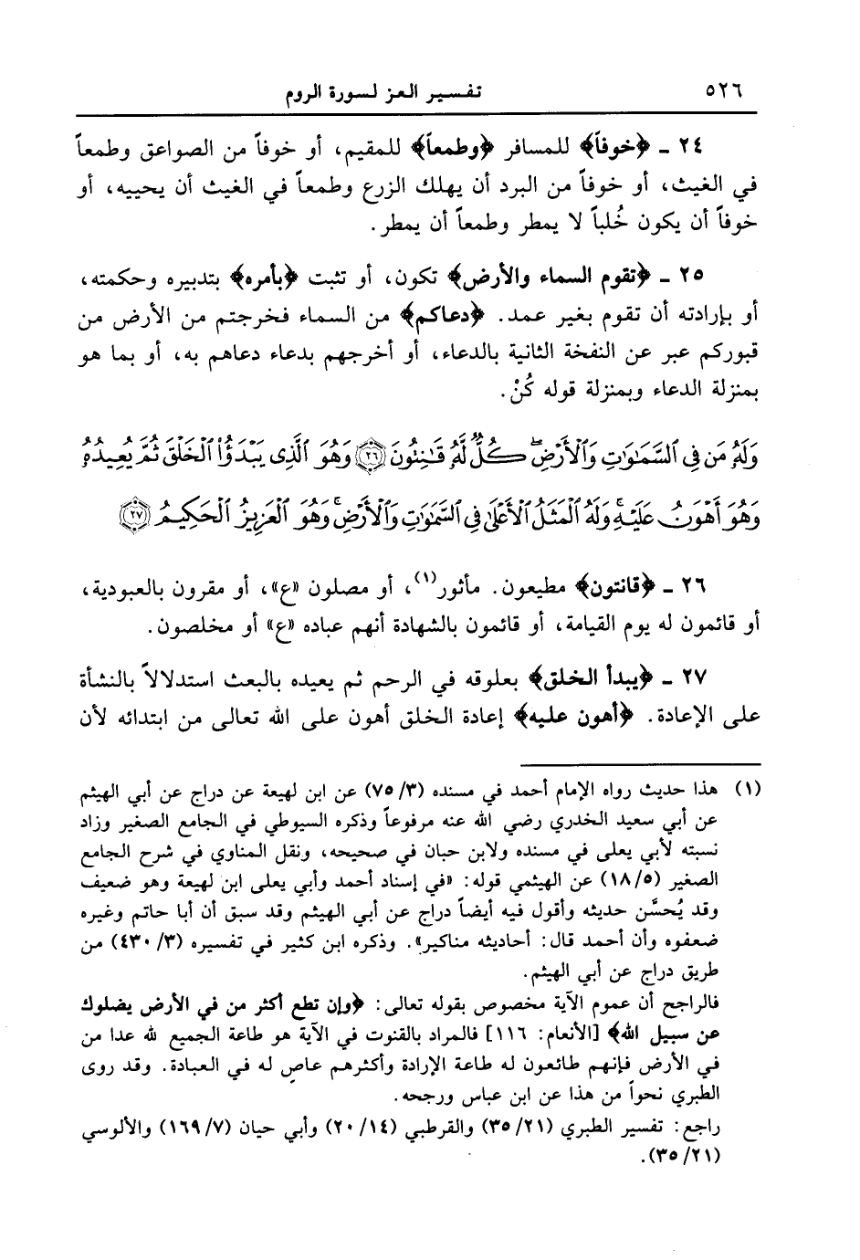 25 - {تقوم السماء والأرض} تكون، أو تثبت {بأمره} بتدبيره وحكمته، أو بإرادته أن تقوم بغير عمد. {دعاكم} من السماء فخرجتم من الأرض من قبوركم عبر عن النفخة الثانية بالدعاء، أو أخرجهم بدعاء دعاهم به، أو بما هو بمنزلة الدعاء وبمنزلة قوله كن. {وله من في السموات والأرض كلّ له قانتون وهو الذي يبدؤا الخلق ثم يعيده وهو أهون عليه وله المثل الأعلى في السموات والأرض وهو العزيز الحكيم}