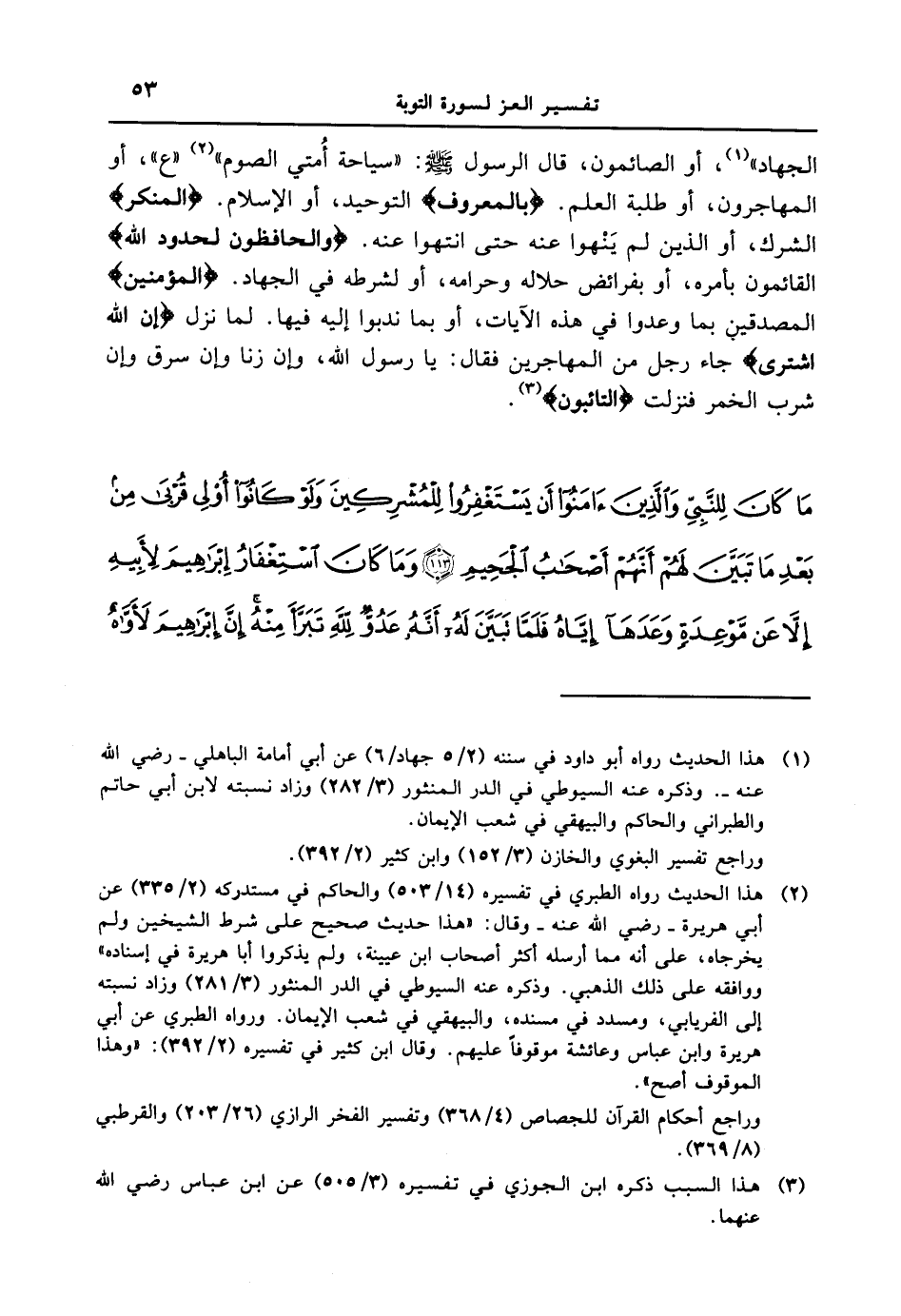 الجهاد، أو الصائمون، قال الرسول [صلى الله عليه وسلم] : " سياحة أُمتي الصوم " " ع "، أو المهاجرون، أو طلبة العلم. {بِالْمَعْرُوفِ} التوحيد، أو الإسلام. {الْمُنكَرِ} الشرك، أو الذين لم يَنْهوا عنه حتى انتهوا عنه. {وَالْحَافِظُونَ لِحُدُودِ اللَّهِ} القائمون بأمره، أو بفرائض حلاله وحرامه، أو لشرطه في الجهاد. {الْمُؤْمِنِينَ} المصدقين بما وعدوا في هذه الآيات، أو بما ندبوا إليه فيها. لما نزل {إِنَّ اللَّهَ اشْتَرَى} جاء رجل من المهاجرين فقال: يا رسول الله، وإن زنا وإن سرق وإن شرب الخمر فنزلت {التَّآئِبُونَ} {ما كان للنبي والذين ءامنوا أن يستغفروا للمشركين ولو كانوا أولى قربى من بعد ما تبين لهم أنهم أصحاب الجحيم وما كان استغفار إبراهيم لأبيه إلا عن موعدةٍ وعدها إيّاه فلمّا تبيّن له أنّه عدوّ لله تبرأ منه إن إبراهيم لأوّاه
