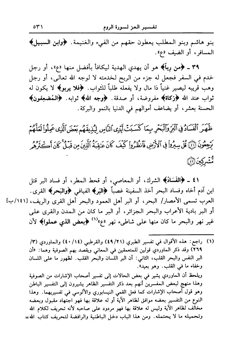 39 - {مِّن رِّباً} هو أن يهدي الهدية ليكافأ بأفضل منها " ع "، أو رجل خدم في السفر فجعل له جزء من الربح لخدمته لا لوجه الله تعالى، أو رجل وهب قريبه ليصير غنياً ذا مال ولا يفعله طلباً للثواب. {فلا يربو} لا يكون له ثواب عند الله {زكَاةٍ} مفروضة، أو صدقة. {وَجْهَ اللَّهِ} ثوابه {الْمُضْعِفُونَ} الحسنة بعشر، أو يضاعف أموالهم في الدنيا بالنمو والبركة. {ظهر الفساد في البر والبحر بما كسبت أيدى الناس ليذيقهم بعض الذي عملوا لعلّهم يرجعون 6 قل سيروا في الأرض فانظروا كيف كان عاقبة الذين من قبل كان أكثرهم مشركين}