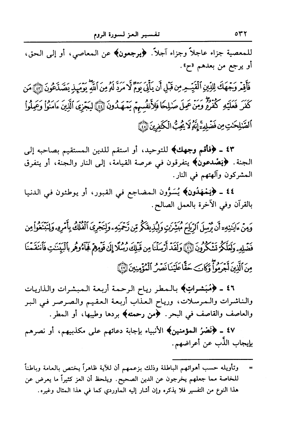 44 - {يَمْهَدُونَ} يُسَوُّون المضاجع في القبور، أو يوطئون في الدنيا بالقرآن وفي الآخرة بالعمل الصالح. {ومن ءاياته أن يرسل الرياح مبشراتٍ وليذيقكم من رحمته ولتجرى الفلك بأمره ولتبغوا من فضله ولعلّكم تشكرون ولقد أرسلنا من قبلك رسلاً إلى قومهم فجاءوهم بالبينات فانتقمنا من الدين أجرموا وكان حقاً علينا نصر المؤمنين}