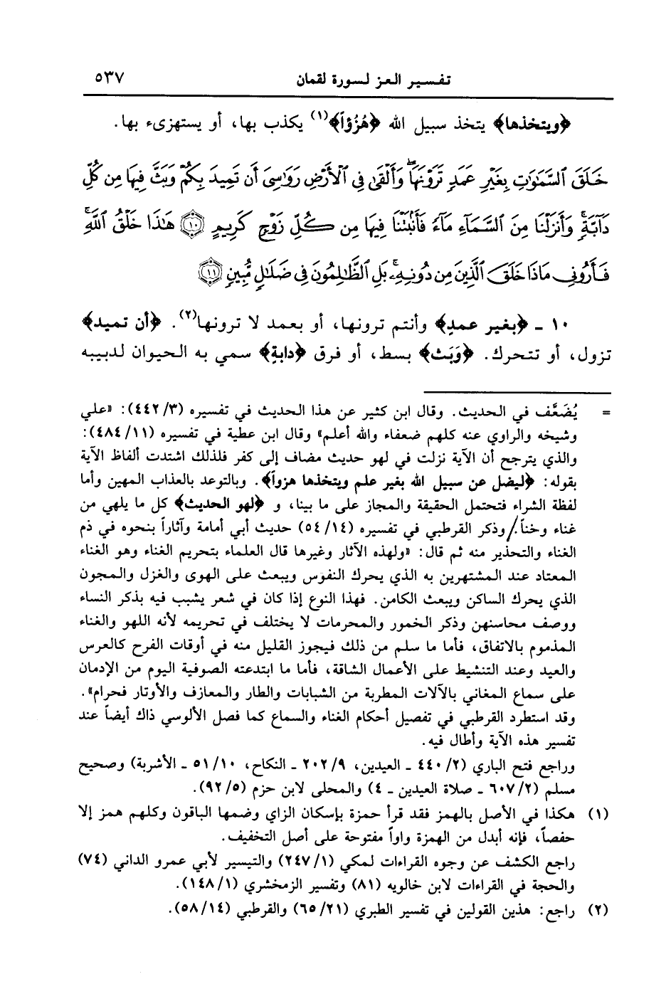{وَيَتَّخِذَهَا} يتخذ سبيل الله {هُزُؤاً} يكذب بها، أو يستهزئ بها. {خلق السماوات بغير عمد ترونها وألقى في الأرض رواسي أن تميد بكم وبث فيها من كل دابة وأنزلنا من السماء ماء فأنبتنا فيها من كل زوج كريم هذا خلق الله فأروني ماذا خلق الذين من دونه بل الظالمون في ضلال مبين}