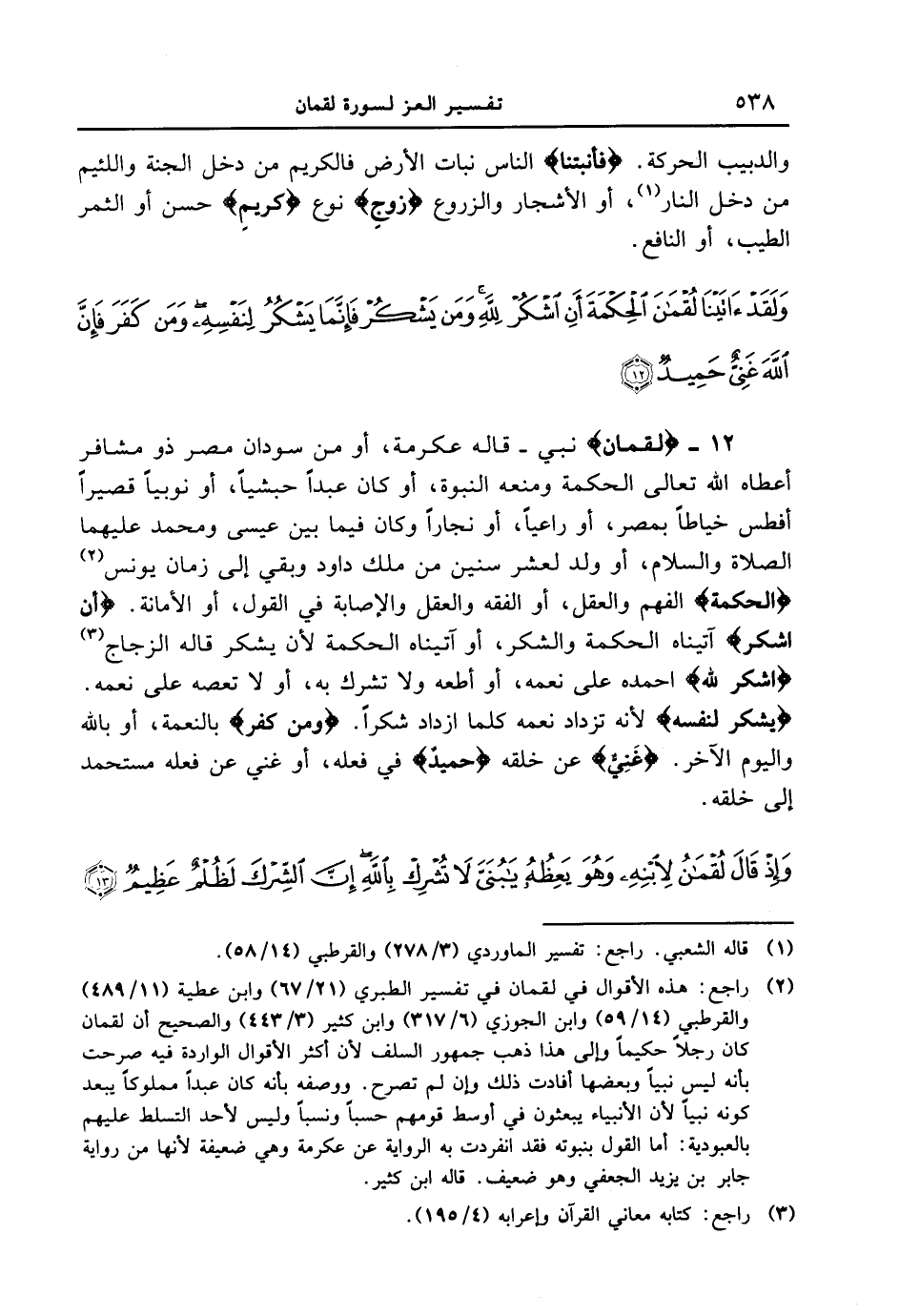 12 - {لُقْمَانَ} نبي - قاله عكرمة، أو من سودان مصر ذو مشافر أعطاه الله تعالى الحكمة ومنعه النبوة، أو كان عبداً حبشياً، أو نوبياً قصيراً أفطس خياطاً بمصر، أو راعياً، أو نجاراً وكان فيما بين عيسى ومحمد عليهما الصلاة والسلام، أو ولد لعشر سنين من ملك داود وبقي إلى زمان يونس {الْحِكْمَةَ} الفهم والعقل، أو الفقه والعقل والإصابة في القول، أو الأمانة {أَنِ اشْكُرْ} أتيناه الحكمة والشكر، أو آتيناه الحكمة لأن يشكر قاله الزجاج {اشْكُرْ لِلَّهِ} أحمده على نعمه، أو أطعه ولا تشرك به، أو لا تعصه على نعمه {يَشْكُرُ لِنَفْسِهِ} لأنه تزداد نعمه كلما ازداد شكراً. {وَمَن كَفَرَ} بالنعمة، أو بالله واليوم الآخر. {غَنِىٌّ} عن خلقه {حَمِيدٌ} في فعله، أو غني عن فعله مستحمد إلى خلقه. {وإذ قال لقمان لابنه وهو يعظه يا بني لاَ تُشْرِكْ بالله إِنَّ الشرك لَظُلْمٌ عظيمٌ