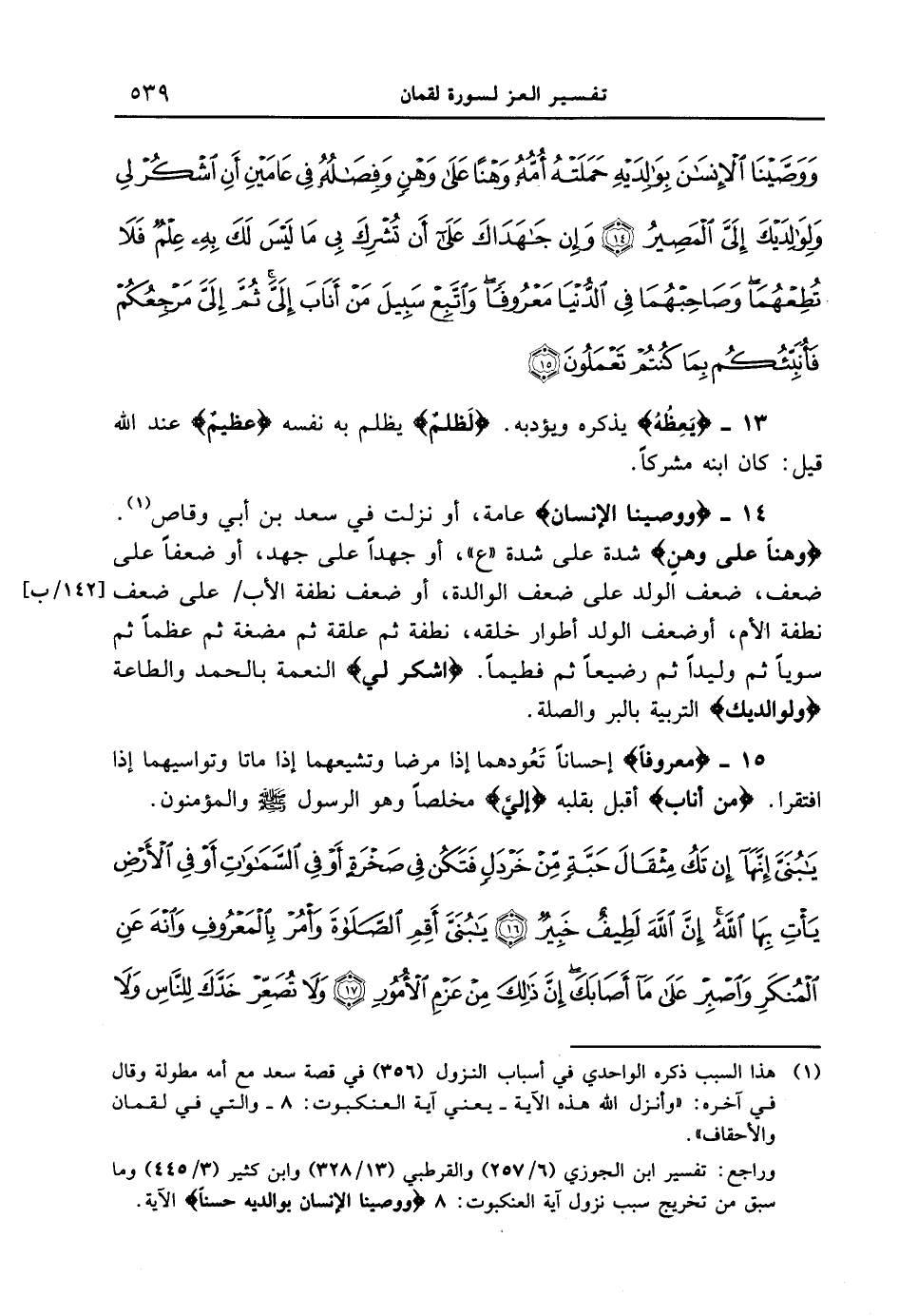 14 - {وَوَصَّيْنَا الإِنسَانَ} عامة، أو نزلت في سعد بن أبي وقاص. {وَهْناً عَلَى وَهْنٍ} شدة على شدة " ع "، أو جهداً على جهد، أو ضعفاً على ضعف، ضعف الولد على ضعف الوالدة، أو ضعف نطفة الأب / [142 / ب] على ضعف نطفة الأم، أو ضعف الولد أطور خلقه، نطفة ثم علقة ثم مضغة ثم عظماً ثم سوياً ثم وليداً ثم رضيعاً ثم فطيماً. {اشْكُرْ لِى} النعمة بالحمد والطاعة {وَلِوَالِدَيْكَ} التربية بالبر والصلة.