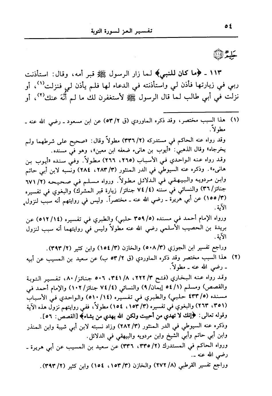 حليمٌ} \ 113 - {ما كان للنبي} لما زار الرسول [صلى الله عليه وسلم] قبر أمه، وقال: استأذنت ربي في زيارتها فأذن لي واستأذنته في الدعاء لها فلم يأذن لي فنزلت، أو نزلت في أبي طالب لما قال الرسول [صلى الله عليه وسلم] لأستغفرن لك ما لم أُنْهَ عنك أو،