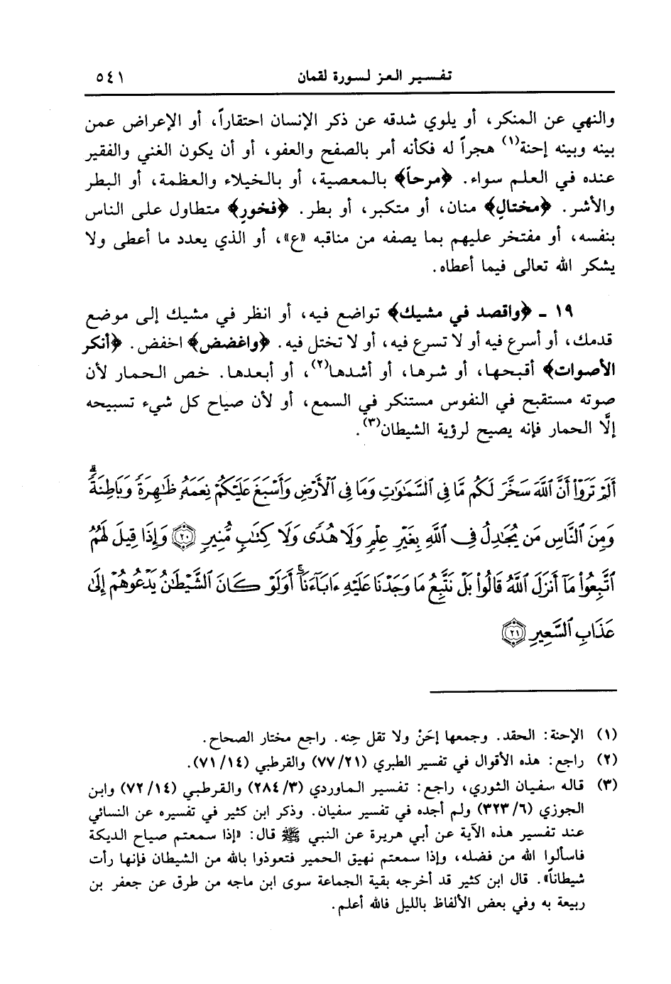 19 - {وَاقْصِدْ فِى مَشْيِكَ} تواضع فيه، أو انظر في مشيك إلى موضع قدمك، أو أسرع فيه أو لا تسرع فيه، أو لا تختل فيه. {وَأَغْضُضْ} اخفض {أَنكَرَ الأَصْوَاتِ} أقبحها، أو شرها، أو أشدها، أو أبعدها. خص الحمار لأن صوته مستقبح في النفوس مستنكر في السمع، أو لأن صياح كل شيء تسبيحه إلاَّ الحمار فإنه يصيح لرؤية الشيطان. {ألم تروا أن الله سخر لكم ما في السموات وما في الأرض وأسبغ عليكم نعمه ظاهرةً وباطنة ومن الناس من يجادل في الله بغير علمٍ ولا هدىً ولا كتاب منيرٍ وإذا قيل لهم اتبعوا ما أنزل الله قالوا بل نتبع ما وجدنا عليه ءاباءنا اولوا كان الشيطان يدعوهم إلى عذاب السعير