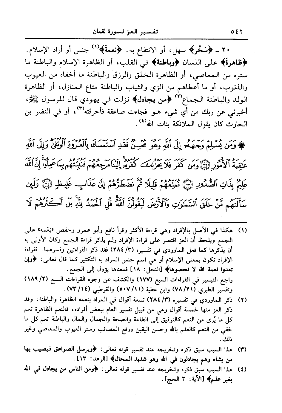 20 - {سَخَّرَ} سهل، أو الانتفاع به. {نعمهُ} جنس أو أراد الإسلام. {ظَاهِرَةً} على اللسان {وَبَاطِنَةً} في القلب، أو الظاهرة الإسلام والباطنة ما ستره من المعاصي، أو الظاهرة الخلق والرزق والباطنة ما أخفاه من العيوب والذنوب، أو ما أعطاهم من الزي والثياب والباطنة متاع المنازل، أو الظاهرة الولد والباطنة الجماع {مَن يجادل} نزلت في يهودي قال للرسول [صلى الله عليه وسلم] ، أخبرني عن ربك من أي شيء هو فجاءت صاعقة فأحرقته، أو في النضر بن الحارث كان يقول الملائكة بنات الله. {ومن يسلم وجهه إلى الله وهو محسن فقد استمسك بالعروة الوثقى وإلى الله عاقبة الأمور ومن كفر فلا يحزنك كفره إلينا مرجعكم فننبّئهم بما عملوا إن الله عليم بذات الصدور نمتعهم قليلاً ثم نضطرهم إلى عذابٍ غليظٍ ولئن سألتهم من خلق السموات والأرض ليقولن الله قل الحمد لله بل أكثرهم لا