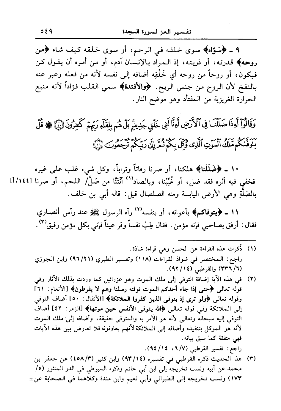 9 - {سَوَّاهُ} سوى خلقه في الرحم، أو سوى خلقه كيف شاء {مِن رُّوحِهِ} قدرته، أو ذريته، إذ المراد بالإنسان آدم، أو من أمره أن يقول كن فيكون، أو روحاً من روحه أي خَلْقِه أضافه إلى نفسه لأنه من فعله وعبر عنه بالنفخ لأن الروح من جنس الريح. {والأَفْئِدَةَ} سمي القلب فؤاداً لأنه منبع الحرارة الغريزية من المفتأد وهو موضع النار. {وقالوا أءذا ضللنا في الأرض أءنا لفى خلق جديد بل هم بلقاء ربهم كافرون قل يتوفاكم ملك الموت الذى وكل بكم ثم إلى ربّكم ترجعون}