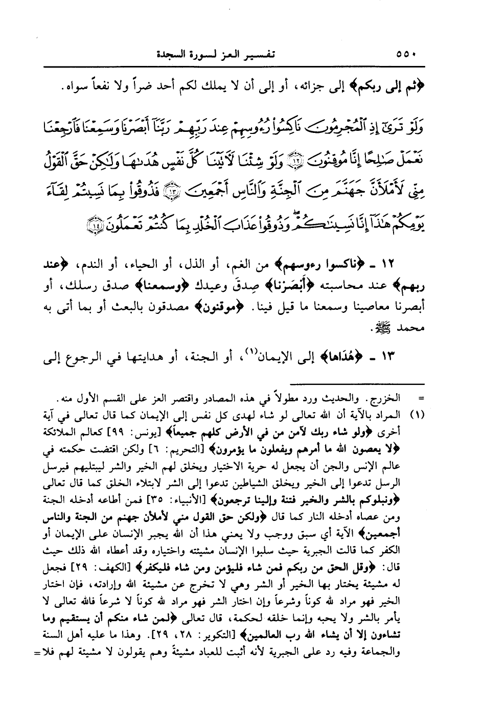 12 - {نَاكِسُواْ رُءُوسِهِمْ} من الغم، أو الذل، أو الحياء، أو الندم، {عِندَ رَبِّهِمْ} عند محاسبته {أَبْصَرْنَا} صِدقَ وعيدك {وَسَمِعْنَا} صدق رسلك، أو أبصرنا معاصينا وسمعنا ما قيل فينا. {مُوقِنُونَ} مصدقون بالبعث أو بما أتى به محمد [صلى الله عليه وسلم] .