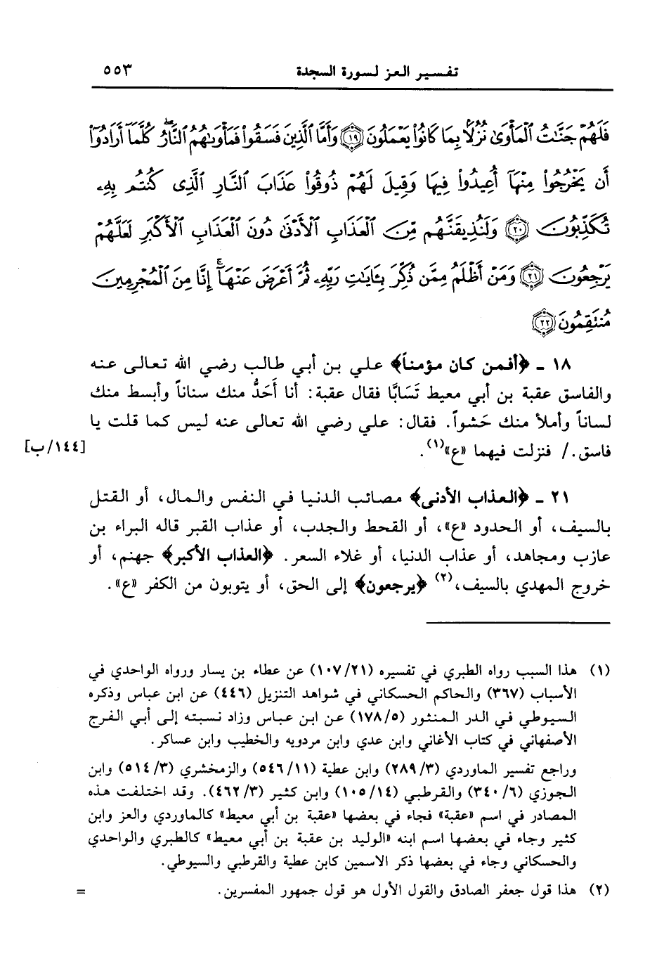21 - {الْعَذَابِ الأَدْنَى} مصائب الدنيا في النفس والمال، أو القتل بالسيف، أو الحدود " ع "، أو القحط والجدب، أو عذاب القبر قاله البراء بن عازب ومجاهد، أو عذاب الدنيا، أو غلاء السعر. {الْعَذَابِ الأَكْبَرِ} جهنم، أو خروج المهدي بالسيف، {يَرْجِعُونَ} إلى الحق، أو يتوبون من الكفر " ع ".