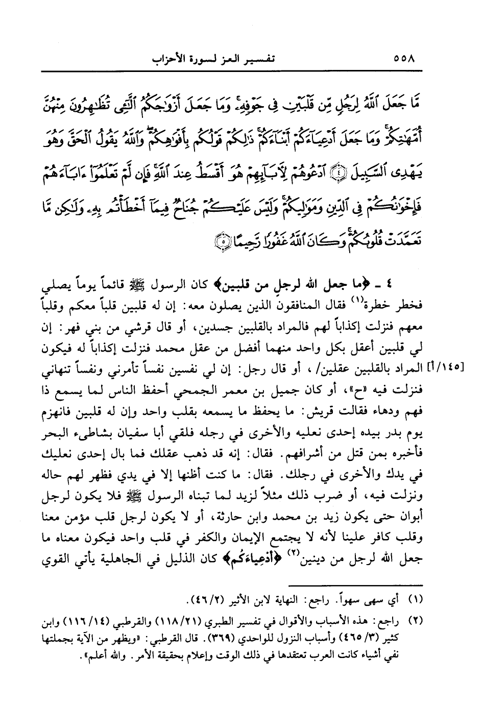 4 - {مَّا جَعَلَ اللَّهُ لِرَجُلٍ مِّن قَلْبَيْنِ} كان الرسول [صلى الله عليه وسلم] قائماً يوماً يصلي فخطر خطرة فقال المنافقون الذين يصلون معه: إنه له قلبين قلباً معكم وقلباً معهم فنزلت إكذاباً لهم فالمراد بالقلبين جسدين، أو قال قرشي من بني فهر: إن لي قلبين أعقل بكل واحد منهما أفضل من عقل محمد فنزلت إكذاباً له فيكون المراد بالقلبين عقلين / [145 / أ] ، أو قال رجل: إن لي نفسين نفساً تأمرني ونفساً تنهاني فنزلت فيه " ح "، أو كان جميل بن معمر الجمحي أحفظ الناس لما يسمع ذا فهم ودهاء فقالت قريش: ما يحفظ ما يسمعه بقلب واحد وإن له قلبين فانهزم يوم بدر بيده إحدى نعليه والأخرى في رجله فلقي أبا سفيان بشاطىء البحر فأخبره بمن قتل من أشرافهم. فقال: إنه قد ذهب عقلك فما بال أحدى نعليك في يدك والأخرى في رجلك. فقال: ما كنت أظنها إلا في يدي فظهر لهم حاله ونزلت فيه، أو ضرب ذلك مثلاً لزيد لما تبناه الرسول [صلى الله عليه وسلم] فلا يكون لرجل أبوان حتى يكون زيد بن محمد وابن حارثة، أو لا يكون لرجل قلب مؤمن معنا وقلب كافر علينا لأنه لا يجتمع الإيمان والكفر في قلب واحد فيكون معناه ما جعل الله لرجل من دينين {أَدْعِيَآءَكُمْ} كان الذليل في الجاهلية يأتي القوي