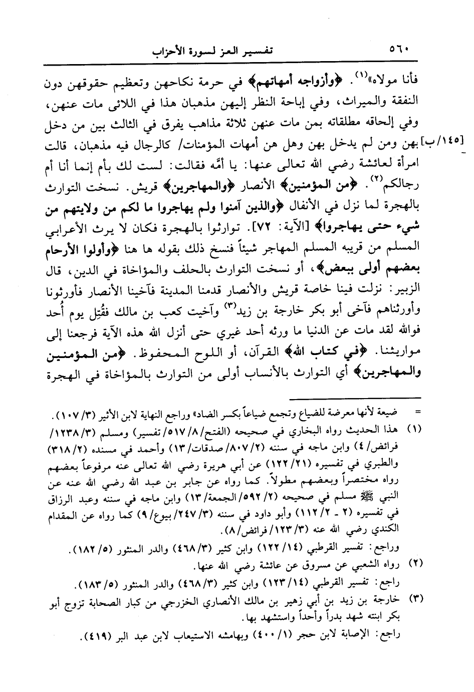 فأنا مولاه ". {وأزواجه أمهاتهم} في حرمة نكاحين وتعظيم حقوقهن دون النفقة والميراث، وفي إباحة النظر إليهن مذهبان هذا في اللائي مات عنهن، وفي إلحاقه مطلقاته بمن مات عنهن ثلاثة مذاهب يفرق في الثلث بين من دخل بهن ومن لم يدخل بهن وهل هن أمهات مؤمنات / [145 / ب] كالرجال فيه مذهبان، قالت امرأة لعائشة رضي الله تعالى عنها: يا أمَّه فقالت: لست لك بأم إنما أنا أم رجالكم. {مِنَ الْمُؤْمِنِينَ} الأنصار {وَالْمُهَاجرِينَ} قريش. نسخت التوارث بالهجرة لما نزل في الأنفال {والذين آمَنُواْ وَلَمْ يُهَاجِرُواْ مَا لَكُمْ مِّن وَلاَيَتِهِم مِّن شَيْءٍ حتى يهاجروا} [الآيه: 72] . توارثوا بالهجرة فكان لا يرث الأعرابي المسلم من قريبه المسلم المهاجر شيئاً فنسخ ذلك بقوله ها هنا {وَأُوْلُواْ الأَرْحَامِ بَعْضُهُمْ أَوْلَى بِبَعْضٍ} ، أو نسخت التوارث بالحلف والمؤاخاة في الدين، قال الزبير: نزلت فينا خاصة قريش والأنصار قدمنا المدينة فآخينا الأنصار فأورثونا وأورثناهم فآخى أبو بكر خارجة بن زيد وآخيت كعب بن مالك فقُتِل يوم أُحد فوالله لقد مات عن الدنيا ما ورثه أحد غيري حتى أنزل الله هذه الآية فرجعنا إلى مواريثنا. {فِى كِتَابِ اللَّهِ} القرآن، أو اللوح المحفوظ. {مِنَ الْمؤْمِنِينَ والْمُهَاجِرِينَ} أي التوارث بالأنساب أولى من التوارث بالمؤاخاة في الهجرة