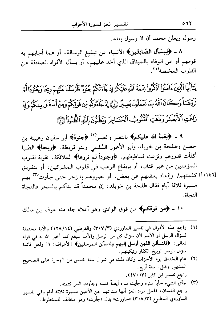 8 - {ليسأل الصَّادِقِينَ} الأنبياء عن تبليغ الرسالة، أو عما أجابهم به قومهم أو عن الوفاء بالميثاق الذي أخذ عليهم، أو يسأل الأفواه الصادقة عن القلوب المخلصة. {ياأيها الذين ءامنوا اذكروا نعمة الله عليكم إذ جآءتكم جنود فأرسلنا عليهم ريحاً وجنوداً لم تروها وكان الله بما تعملون بصيراً إذا جاءوكم من فوقكم ومن أسفل منكم وإذ زاغت الأبصار وبلغت القلوب الحناجر وتظنّون بالله الظّنونا}