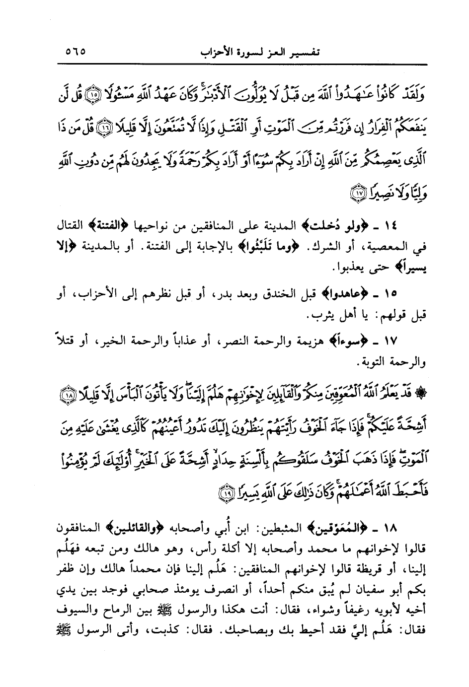 17 - {سُوءًا} هزيمة والرحمة النصر، أو عذاباً والرحمة الخير، أو قتلاً والرحمة التوبة. {قد يعلم الله المعوقين منكم والقآئلين لإخوانهم هلم إلينا ولا يأتون البأس إلا قليلاً أشحة عليكم فإذا جآء الخوف رأيتهم ينظرون إليك تدور أعينهم كالذى يغشى عليه من الموت فإذا ذهب الخوف سلقوكم بألسنة حداد أشحة على الخير أولئك لم يؤمنوا فأحبط الله أعمالهم وكان ذلك على الله يسيراً}