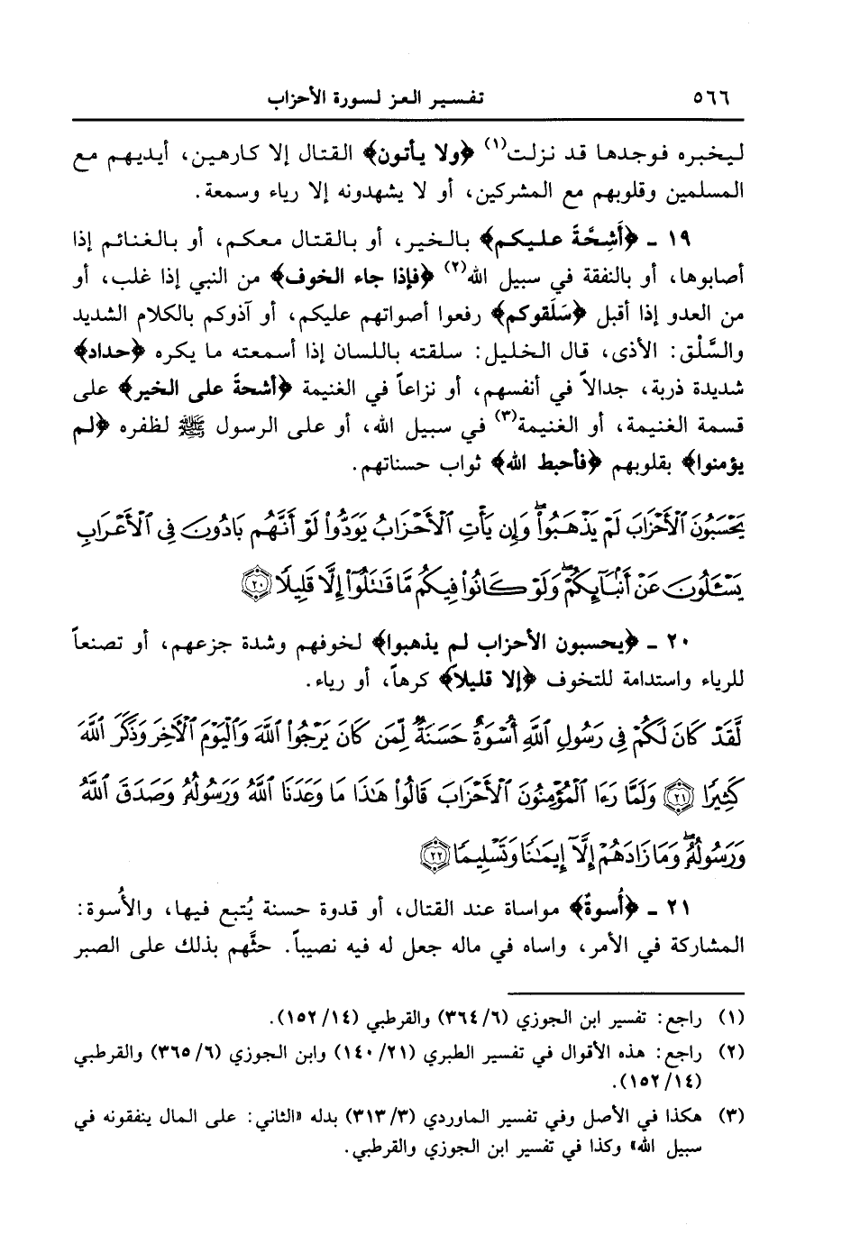 20 - {يَحْسَبُونَ الأَحْزَابَ لَمْ يَذْهَبُواْ} لخوفهم وشدة جزعهم، أو تصنعاً للرياء واستدامة للتخوف {إِلاَّ قَلِيلاً} كرهاً، أو رياء. {لقد كان لكم فى رسول الله أسوة حسنة لمن كان يرجوا الله واليوم الأخر وذكر الله كثيراً ولما رءا المؤمنون الأحزاب قالوا هذا ما وعدنا الله ورسوله وصدق الله ورسوله وما زادهم إلا إيماناً وتسليماً}