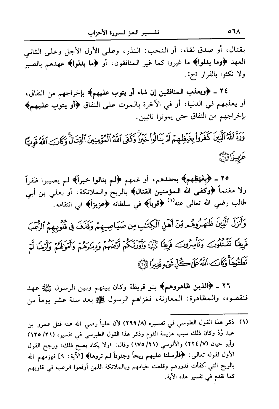25 - {بِغَيْظِهِمْ} بحقدهم، أو غمهم {لَمْ يَنَالُواْ خَيْراً} لم يصيبوا ظفراً ولا مغنماً {وَكَفَى اللَّهُ المؤمنين القتال} بالريح والملائكة، أو بعلي بن أبي طالب رضي الله تعالى عنه {قَوِيّاً} في سلطانه {عَزِيزاً} في انتقامه. {وأنزل الذين ظاهروهم من أهل الكتاب من صياصيهم وقذف في قلوبهم الرعب فريقاً تقتلون وتأسرون فريقاً وأورثكم أرضهم وديارهم وأموالهم وأرضا لم تطئوها وكان الله على كل شيء قديراً}