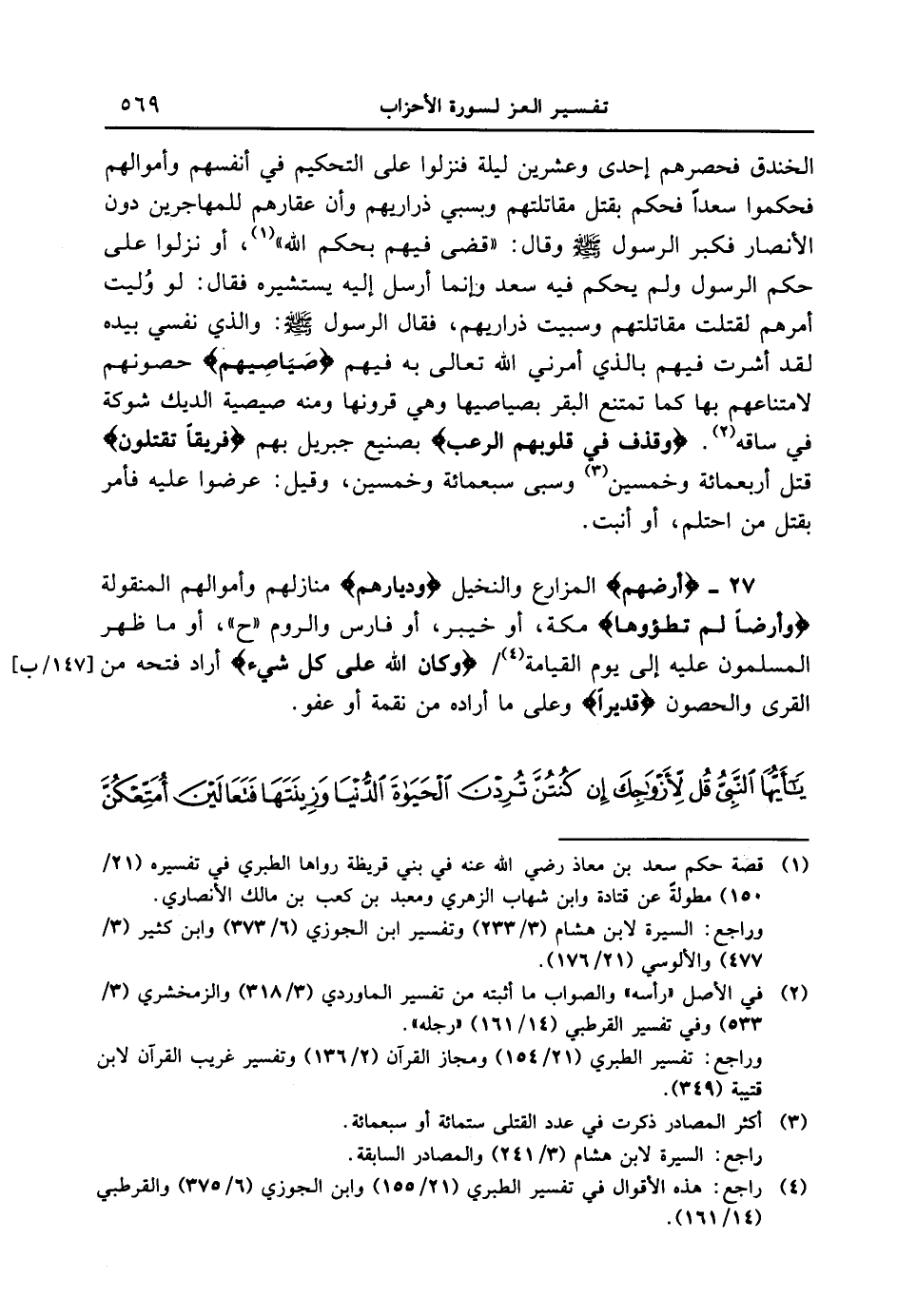 27 - {أَرْضَهُمْ} المزارع والنخيل {وَدِيَارَهُمْ} منازلهم وأموالهم المنقولة {وأرضا لم تطؤوها} مكة، أو خيبر، أو فارس والروم " ح "، أو ما ظهر المسلمون عليه إلى يوم القيامة / [147 / ب] {وَكَانَ اللَّهُ عَلَى كُلِّ شَىْءٍ} أراد فتحه من القرى والحصون {قَدِيراً) وعلى ما أراده من نقمة أو عفو. {ياأيها النبي قل لأزواجك إن كنتن تردن الحياة الدنيا وزينتها فتعالين أمتعكن