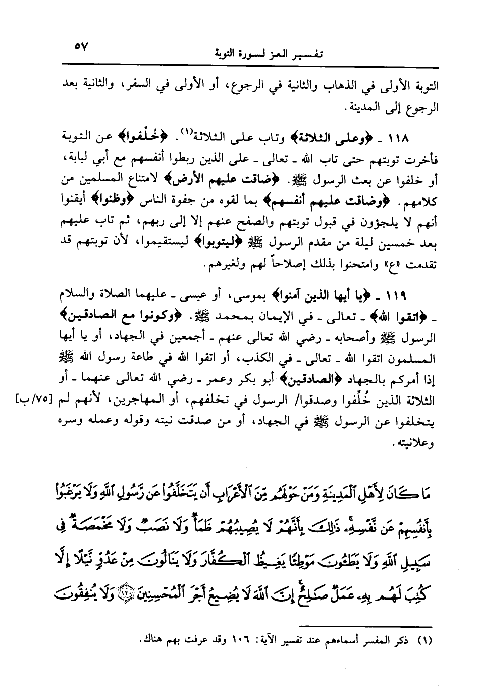119 - {يا أيها الذين آمنوا} بموسى، أو عيسى - عليهما الصلاة والسلام - {اتَّقُواْ الله} - تعالى - في الإيمان بمحمد [صلى الله عليه وسلم] . {وكونوا مع الصادقين} الرسول [صلى الله عليه وسلم] وأصحابه - تعالى - رضي الله عنهم - أجمعين في الجهاد، أو يا أيها المسلمين اتقوا الله - تعالى - في الكذب، أو اتقوا الله في طاعة رسول الله [صلى الله عليه وسلم] إذا أمركم بالجهاد {الصَّادِقِينَ} أبو بكر وعمر - رضي الله تعالى عنهما - أو الثلاثة الذين خُلِّفوا وصدقوا / الرسول في تخلفهم، أو المهاجرين، لأنهم لم يتخلفوا عن الرسول [صلى الله عليه وسلم] في الجهاد، أو من صدقت نيته وقوله وعمله وسره وعلانيته. {ما كان لأهل المدينة ومن حولهم من الأعراب أن يتخلّفوا عن الرسول الله ولا يرغبوا بأنفسهم عن نفسه ذلك بأنهم لا يصيبهم ظمأ ولا نصبٌ ولا مخمصةٌ فىِ سبيل الله ولا يطئون موطئاً يغيظ الكفار ولا ينالون من عدوّ نّيلاً إلا كُتب لهم به عملٌ صالح إن الله لا يضيع أجر المحسنين ولا ينفقون