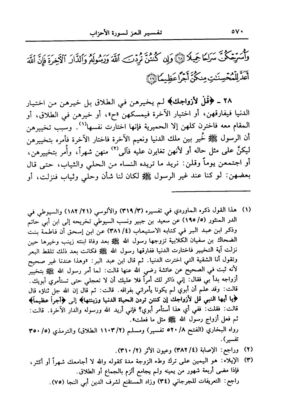 28 - {قُل لأَزْوَاجِكَ} لم يخيرهن في الطلاق بل خيرهن من اختيار الدنيا فيفارقهن، أو اختيار الآخرة فيمسكهن " ح "، أو خيرهن في الطلاق، أو المقام معه فاخترن كلهن إلا الحميرية فإنها اختارت نفسها. وسبب تخييرهن أن الرسول [صلى الله عليه وسلم] خُير بين ملك الدنيا ونعيم الآخرة فاختار الآخرة فأمره بتخييرهن ليكنَّ على مثل حاله أو لأنهن تغايرن عليه فآلى منهن شهراً، وأُمر بتخييرهن، أو اجتمعن يوماً وقلن: نريد ما تريده النساء من الحلي والثياب، حتى قال بعضهن: لو كنا عند غير الرسول [صلى الله عليه وسلم] لكان لنا شأن وحلي وثياب فنزلت، أو