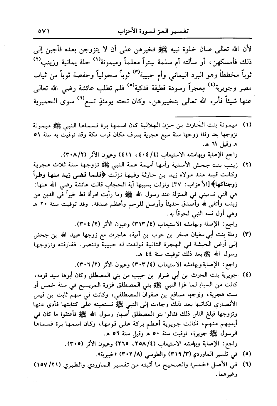 لأن الله تعالى صان خلوة نبيه [صلى الله عليه وسلم] فخيرهن على أن لا يتزوجن بعده فأجبن إلى ذلك فأمسكهن، أو سألته أم سلمة سِتراً معلماً وميمونة حلة يمانية وزينب ثوباً مخططاً وهو البرد اليماني أم حبيبة ثوباً سحولياً وحفصة ثوباً من ثياب مصر وجويرية مِعجراً وسودة قطيفة فدكية فلم تطلب عائشة رضي الله تعالى عنها شيئاً فأمره الله تعالى بتخييرهن، وكان تحته يومئذٍ تسع سوى الحميرية