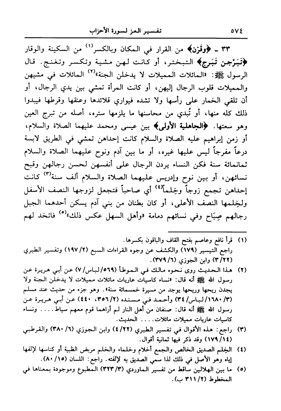 33 - {وقرن} من القرار في مكان وبالكسر من السكينة والوقار {تبرجن تبرج} التبخير، أو كانت لهن مشية وتكسر وتغنج. قال الرسول [صلى الله عليه وسلم] : " المائلات المميلات لا يدخلن الجنة " المائلات في مشيهن والمميلات قلوب الرجال إليهن، أو كانت المرأة تمشي بين الرجال، أو أن تلقي الخمار على رأسها ولا تشده فيواري قلائدها وعنقها وقرطها فيبدوا ذلك كله منها، أو تُبدي من محاسنها ما يلزمها ستره، أصله من تبرج العين وهو سعتها. {الْجَاهِليَّةِ الأُولَى} بين عيسى ومحمد عليهما الصلاة والسلام، أو زمن إبراهيم عليه الصلاة السلام كانت أحداهن تمشي في الطريق لابسة درعاً مفرجاً ليس عليها غيره، أو ما بين آدم ونوح عليهما الصلاة والسلام، ثمانمائة سنة فكن النساء يردن الرجال على أنفسهن لحسن رجالهن وقبح نسائهن، أو بين نوح وإدريس عليهما الصلاة والسلام ألف سنة كانت إحداهن تجمع زوجاً وخِلماً أي صاحباً فتجعل لزوجها النصف الأسفل ولخِلمها النصف الأعلى، أو كان بطنان من بني آدم يسكن أحدهما الجبل رجالهم صِبَاح وفي نسائهم دمامة " وأهل السهل عكس ذلك " فاتخذ لهم