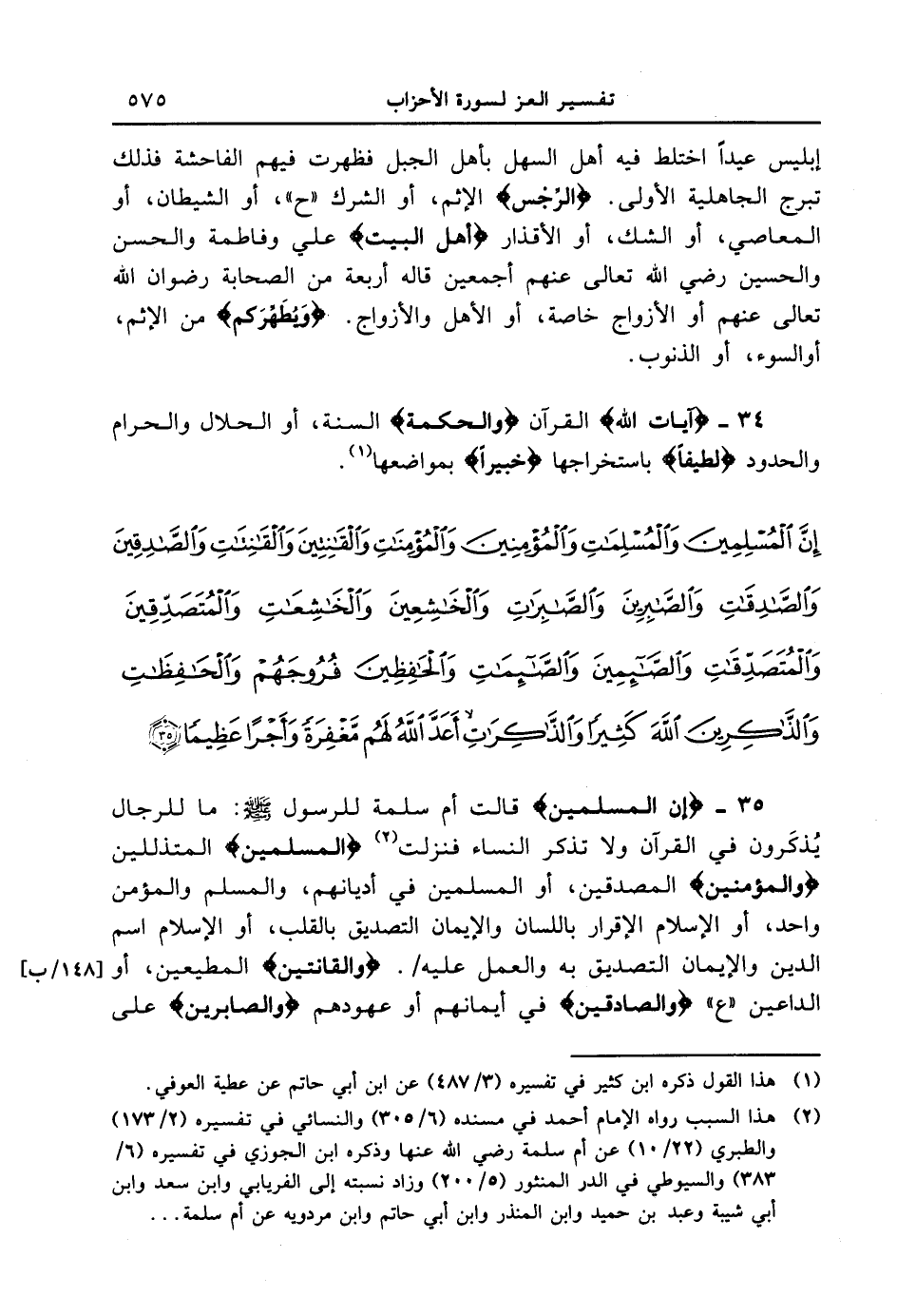 35 - {إن المسلمين} قالت أم سلمة للرسول [صلى الله عليه وسلم] : ما للرجال يُذكَرون في القرآن ولا تذكر النساء فنزلت {الْمُسْلِمِينَ} المتذللين {وَالْمُؤْمِنِينَ} المصدقين، أو المسلمين في أديانهم، والمسلم والمؤمن واحد، أو الإسلام الإقرار باللسان والإيمان التصديق بالقلب، أو الإسلام اسم الدين والإيمان التصديق به والعمل عليه / [148 / ب] . {والقانتين} المطيعين، أو الداعين " ع " {والمصدقين} في أيمانهم أو عهودهم {وَالْصَّابِرينَ} على