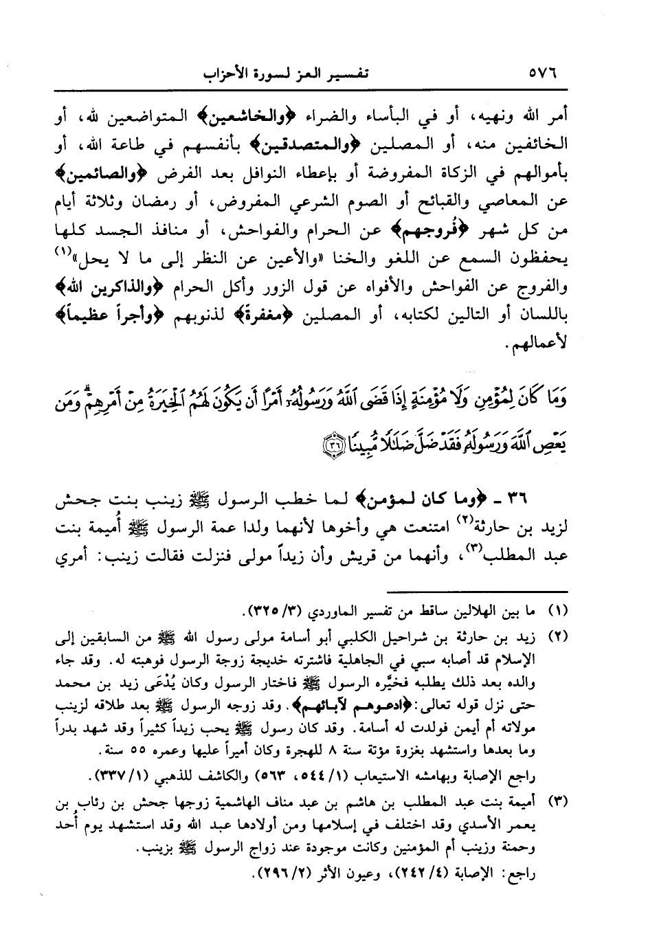 36 - {وما كان لمؤمن} لما خطب الرسول [صلى الله عليه وسلم] زينب بنت جحش لزيد بن حارثة امتنعت هي وأخوها لأنهما ولداً عمة الرسول [صلى الله عليه وسلم] أُميمة بنت عبد المطلب، وأنهما من قريش وأن زيداً مولى فنزلت فقالت زينب: أمري