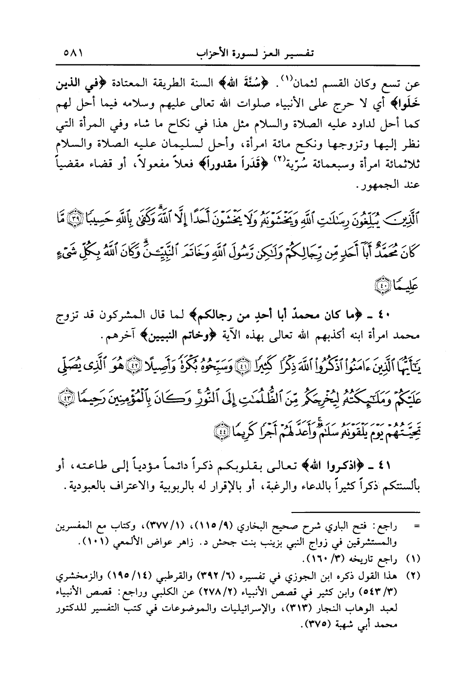 40 - {مَّا كَانَ مُحَمَّدٌ أَبَآ أَحَدٍ مِّن رِّجَالِكُمْ} لما قال المشركون قد تزوج محمد امرأة ابنه أكذبهم الله تعالى بهذه الآية {وَخَاتَمَ النبيين} آخرهم. {يا أيها الذين ءامنوا اذكروا الله ذكراً كثيراً وسبّحوه بكرةً وأصيلاً هو الذي يصلى عليكم وملائكته ليخرجكم من الظلمات إلى النور وكان بالمؤمنين رحيماً تحيتهم يوم يلقونه سلامٌ وأعدّ لهم أجراً كريماً}