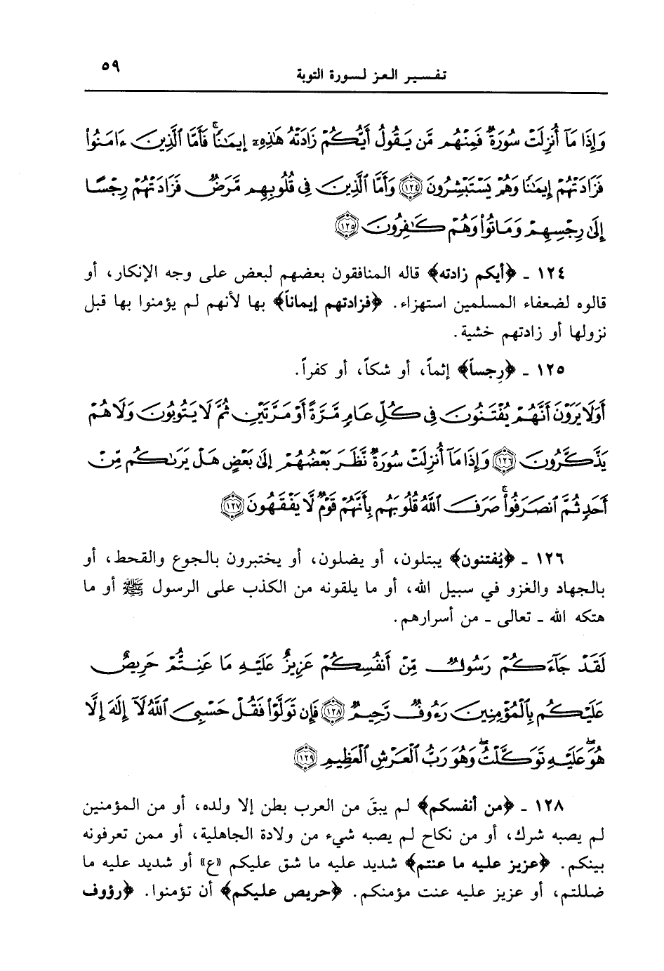 126 - {يُفْتَنُونَ} يُبتلون، أو يضلون، أو يُختبرون بالجوع والقحط، أو بالجهاد والغزو في سبيل الله، أو ما يلقونه من الكذب على الرسول [صلى الله عليه وسلم] أو ما هتكه الله - تعالى - من أسرارهم. {لقد جاءكم رسولٌ مّن أنفسكم عزيز عليه ما عنتّم حريص عليكم بالمؤمنين رءوفُ رّحيمٌ فإن تولّوا فقل حسبى الله لآ إله إلا هو عليه توكّلت وهو ربّ العرش العظيم}