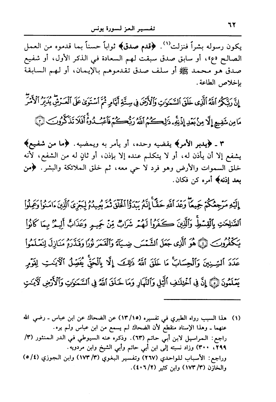 3 - {يُدَبِّرُ الأَمْرَ} يقضيه وحده، أو يأمر به ويمضيه. {مَا مِن شَفِيعٍ} يشفع إلا أن يأذن له، أو لا يتكلم عنده إلا بإذن، أو ثانٍ له من الشفع، لأنه خلق السموات والأرض وهو فرد لا حي معه، ثم خلق الملائكة والبشر. {مِن بَعْدِ إذنه} أمره كن فكان. {إليه مرجعكم جميعاً وعد الله حقاً إنه يبدؤا الخلق ثم يعيده ليجزى الذين ءامنوا وعملوا الصالحات بالقسط والذين كفروا لهم شرابٌ من حميم وعذاب أليم بما كانوا يكفرون هو الذي جعل الشمس ضياءً والقمر نوراً وقدّره منازل لتعلموا عدد السنين والحساب ما خلق الله ذلك إلا بالحق يفصل الآيات لقوم يعلمون إن في اختلاف الليل والنهار وماخلق الله في السموات والأرض لأيات