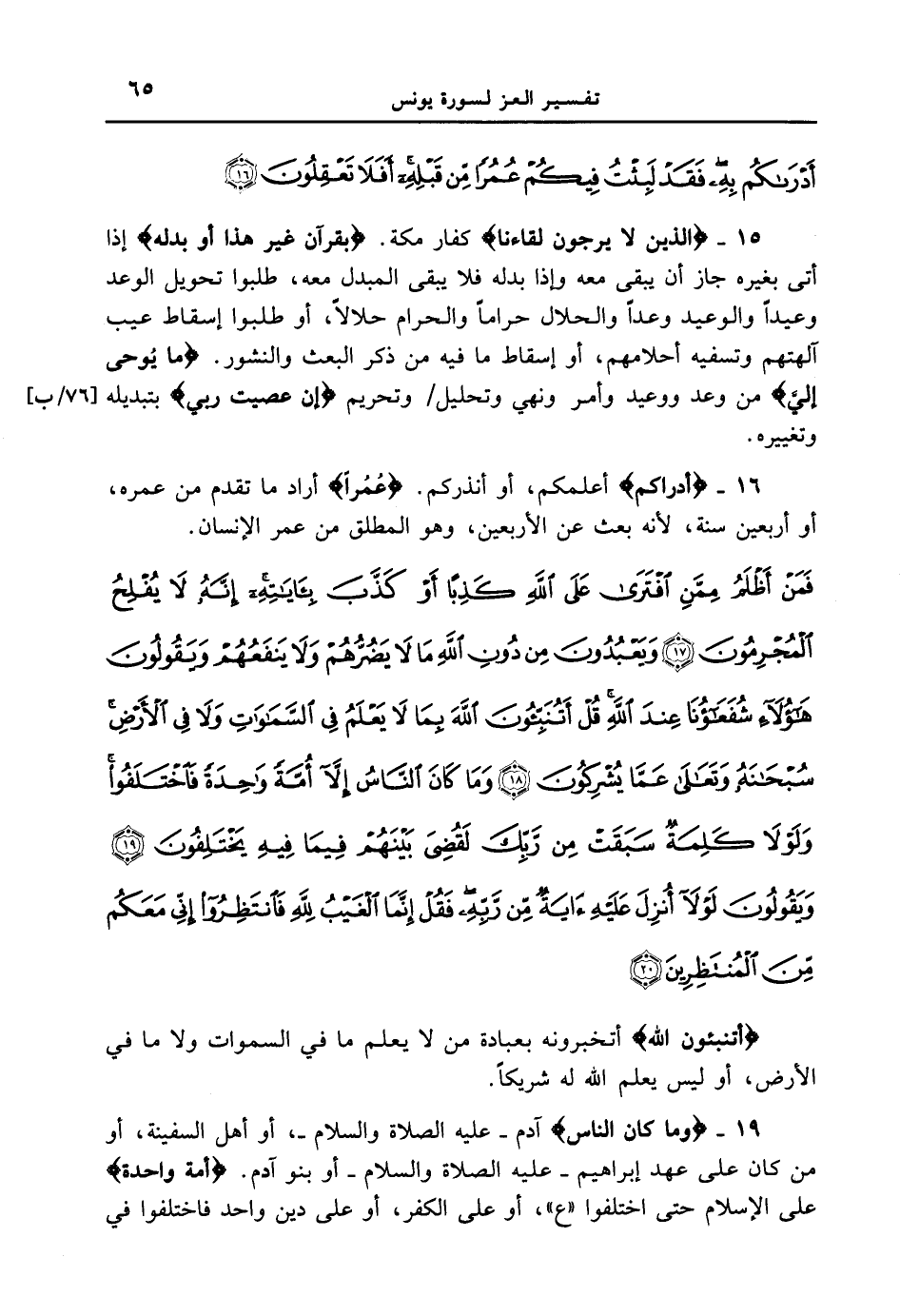 أدراكم به فقد لبثت فيكم عمرا من قبله أفلا تعقلون} 15 _ {الذين لا يرجون لقاءنا} كفار مكة. {بقرآن غَيْرِ هَذّآ أَوْ بَدِّلْهُ} إذا أتى بغيره جاز أن يبقى معه وإذا بدله فلا يبقى المبدل معه، طلبوا تحويل الوعد وعيداً والوعيد وعداً والحلال حراماً والحرام حلالاً، أو طلبوا إسقاط عيب آلهتهم وتسفيه أحلامهم، أو إسقاط ما فيه من ذكر البعث والنشور. {مَا يُوحَى إِلَىَّ} من وعد ووعيد وأمر ونهي وتحليل / [76 / ب] وتحريم {إِنْ عَصَيْتُ رَبِّى} بتبديله وتغييره 16 - {أَدْرَاكُم} أعلمكم، أو أنذركم. {عمراً} أراد ما بقدم من عمره، أو أربعين سنة، لأنه بُعث عن الأربعين، وهو المطلق من عمر الإنسان. {فمن أظلم ممن افترى على الله كذباً أو كذب بئاياته إنه لا يفلح المجرمون ويعبدون من دون الله ما لا يضرهم ولا ينفعهم ويقولون هاولاء شفعاؤنا عند الله قل أتنّبئون الله بما لا يعلم في السموات ولا في الأرض سبحانه وتعالى عما يشركون وما كان الناس إلا أمة واحدة فاختلفوا ولولا كلمة سبقت من ربك لقضى بينهم فيما فيه يختلفون ويقولون لولا أنزل عليه آية من ربه فقل إنما الغيب لله فانتظروا إنّى معكم من المنتظرين} {أَتُنَبِِّئُونَ اللَّهَ} أتخبرونه بعبادة من لا يعلم ما في السموات ولا ما في الأرض، أو ليس يعلم الله له شريكاً 19 _ {وَمَا كان الناس} آدم - عليه الصلاة والسلام -، أو أهل السفينة، أو من كان على عهد إبراهيم - عليه الصلاة والسلام - أو بنو آدم. {أُمَّةً وَاحِدَةً} على الإسلام حتى اختلفوا " ع " أو على الكفر، أو على دين واحد فاختلفوا في