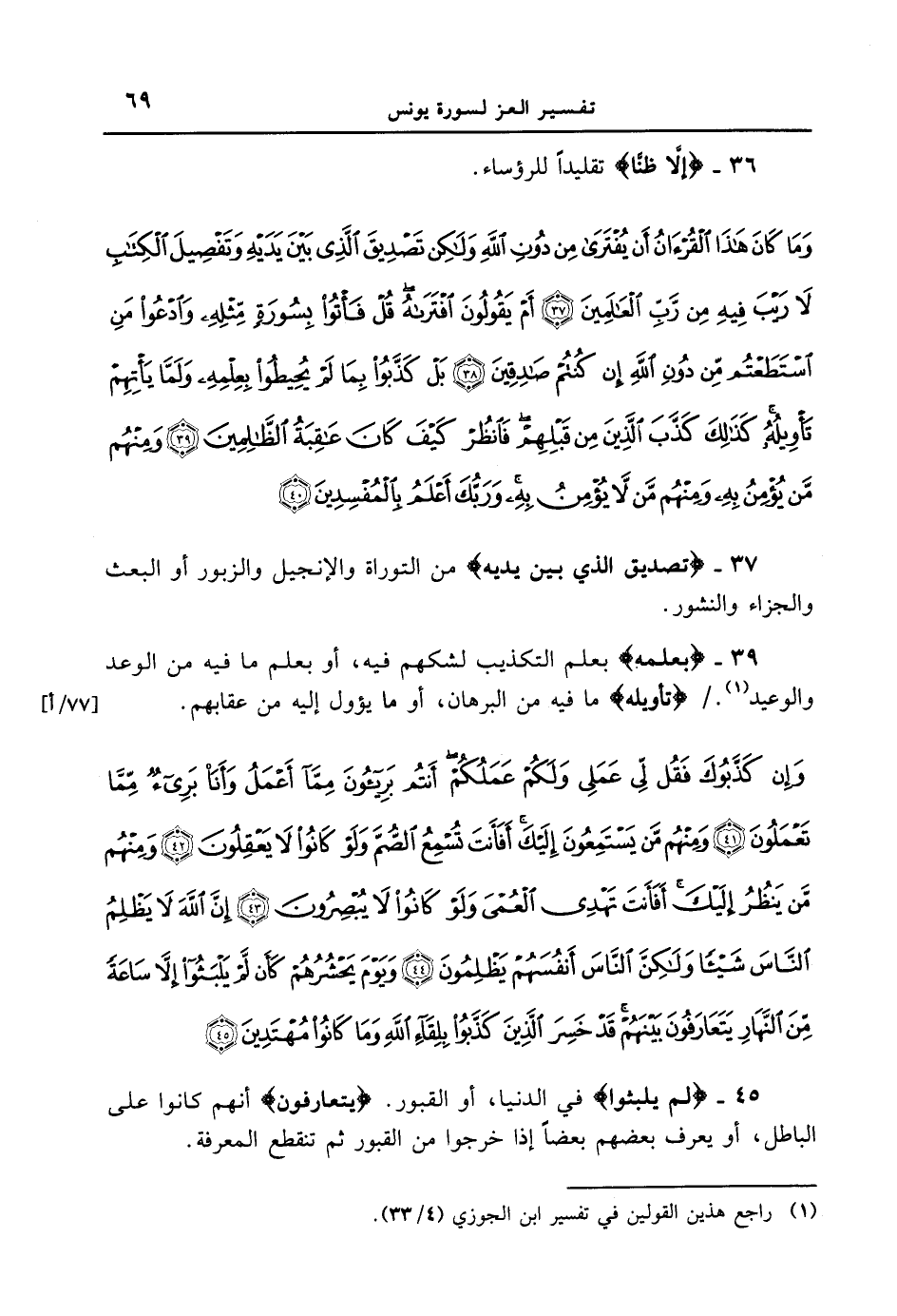 36 - {إلا ظنا} تقليداً للرؤساء. {وما كان هذا القرءان أن يفترى من دون الله ولكن تصديق الذى بين يديه وتفصيل الكتاب لا ريب فيه من رب العالمين أم يقولون افتراه قل فأتوا بسورة مثله وادعوا من استطعتم من دون الله إن كنتم صادقين بل كذبوا بما لم يحيطوا بعلمه ولما يأتهم تأويله كذلك كذب الذين من قبلهم فأنظر كيف كان عاقبة الظالمين ومنهم من يؤمن به ومنهم من لا يؤمن به وربك أعلم بالمفسدين}