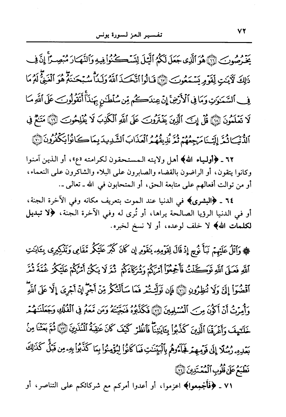 64 - {الْبُشْرَى} في الدنيا عند الموت بتعريف مكانه وفي الآخرة الجنة، أو في الدنيا الرؤيا الصالحة يراها، أو تُرى له وفي الآخرة الجنة، {لا تَبْدِيلَ لِكَلِمَاتِ اللَّهِ} لا خلف لوعده، أو لا نسخ لخبره. {واتل عليهم نبأ نوحٍ إذ قال لقومه يا قوم إن كان كبر عليكم مقامي وتذكيري بئايات الله فعلى الله توكّلت فأجمعوا أمركم وشركاءكم ثمّ لا يكن أمركم عليكم غمّة ثم اقضوا إلىّ ولا تنظرون فإن توليتم فما سألتكم من أجر إن أجري إلا على الله وأمرت أن أكون من المسلمين فكذبوه فنجيناه ومن معه في الفلك وجعلناهم خلائف وأغرقنا الذين كذّبوا بئاياتنا فانظر كيف كان عاقبة المنذرين ثمّ بعثنا من بعده رسلاً إلى قومهم فجاءوهم بالبينات فما كانوا ليؤمنوا بما كذبوا به من قبل كذلك نطبع على قلوب المعتدين}