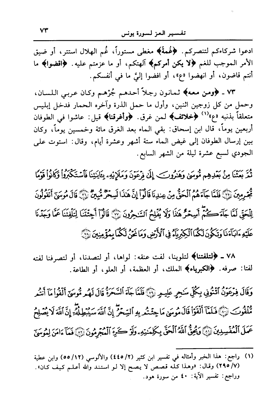 73 - {وَمَن مَّعَهُ} ثمانون رجلاً أحدهم جُرْهم وكان عربي اللسان، وحمل من كل زوجين اثنين، وأول ما حمل الذرة وآخره الحمار فدخل إبليس متعلقاً بذنبه " ع " {خَلآئِفَ} لمن غرق. {وَأَغْرَقْنَا} قيل: عاشوا في الطوفان أربعين يوماً، قال ابن إسحاق: بقي الماء بعد الغرق مائة وخمسين يوماً، وكان بين إرسال الطوفان إلى غيض الماء ستة أشهر وعشرة أيام، وقال: استوت على الجودي لسبع عشرة ليلة من الشهر السابع. {ثم بعثنا من بعدهم موسى وهارون إلى فرعون وملإئه بئاياتنا فاستكبروا وكانوا قوماً مجرمين فلمّا جاءهم الحق من عندنا قالوا إن هذا لسحرٌ مبين قال موسى أتقولون للحق لمّا جاءكم أسحرٌ هذا ولا يفلح الساحرون قالوا أجئتنا لتلفتنا عما وجدنا عليه ءاباءنا وتكون لكما الكبرياء في الأرض وما نحن لكما بمؤمنين}
