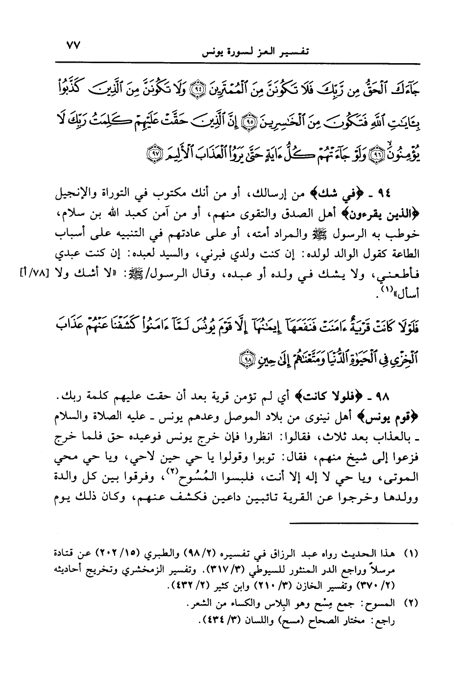 94 - {فِى شَكٍّ} من إرسالك، أو من أنك مكتوب في التوراة والإنجيل {الَّذِينَ يَقْرَءُونَ} أهل الصدق والتقوى منهم، أو من آمن كعبد الله بن سلام، خوطب به الرسول [صلى الله عليه وسلم] والمراد أمته، أو على عادتهم في التنبيه على أسباب الطاعة كقول الوالد لولده: إن كنت ولدي فبرني، والسيد لعبده: إن كنت عبدي [78 / أ] فأطعني، ولا يشك في ولده أو عبده، وقال الرسول / [صلى الله عليه وسلم] : " لا أشك ولا أسأل ". {فلولا كانت قرية ءامنت فنفعها إيمانها إلا قوم يونس لما ءامنوا كشفنا عنهم عذاب الخزي في الحياة الدنيا ومتعناهم إلى حين}