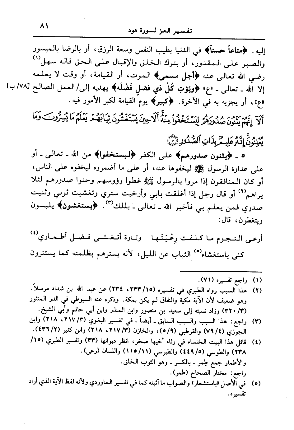 5 - {يَثْنُونَ صُدُورَهُمْ} على الكفر {لِيَسْتَخْفُواْ} من الله - تعالى أو على عداوة الرسول [صلى الله عليه وسلم] ليخفوها عنه، أو على ما أضمروه ليخفوه على الناس، أو كان المنافقون إذا مروا بالرسول [صلى الله عليه وسلم] غطوا رؤوسهم وحنوا صدورهم لئلا يراهم أو قال رجل إذا أغلقت بابي وأرخيت ستري وتغشيت ثوبي وثنيت صدري فمن يعلم بي فأخبر الله - تعالى - بذلك. {يَسْتَغْشُونَ} يلبسون ويتغطون، قال: