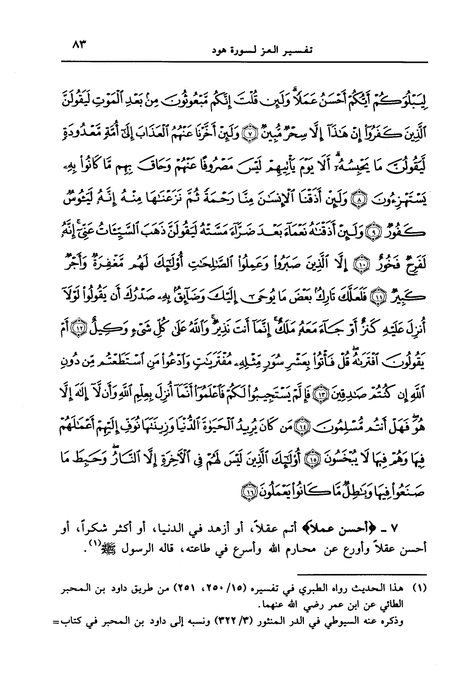 7 - {أَحْسَنُ عَمَلاً} أتم عقلاً، أو أزهد في الدنيا، أو أكثر شكراً، أو أحسن عقلاً وأورع عن محارم الله وأسرع في طاعته، قاله الرسول [صلى الله عليه وسلم] .