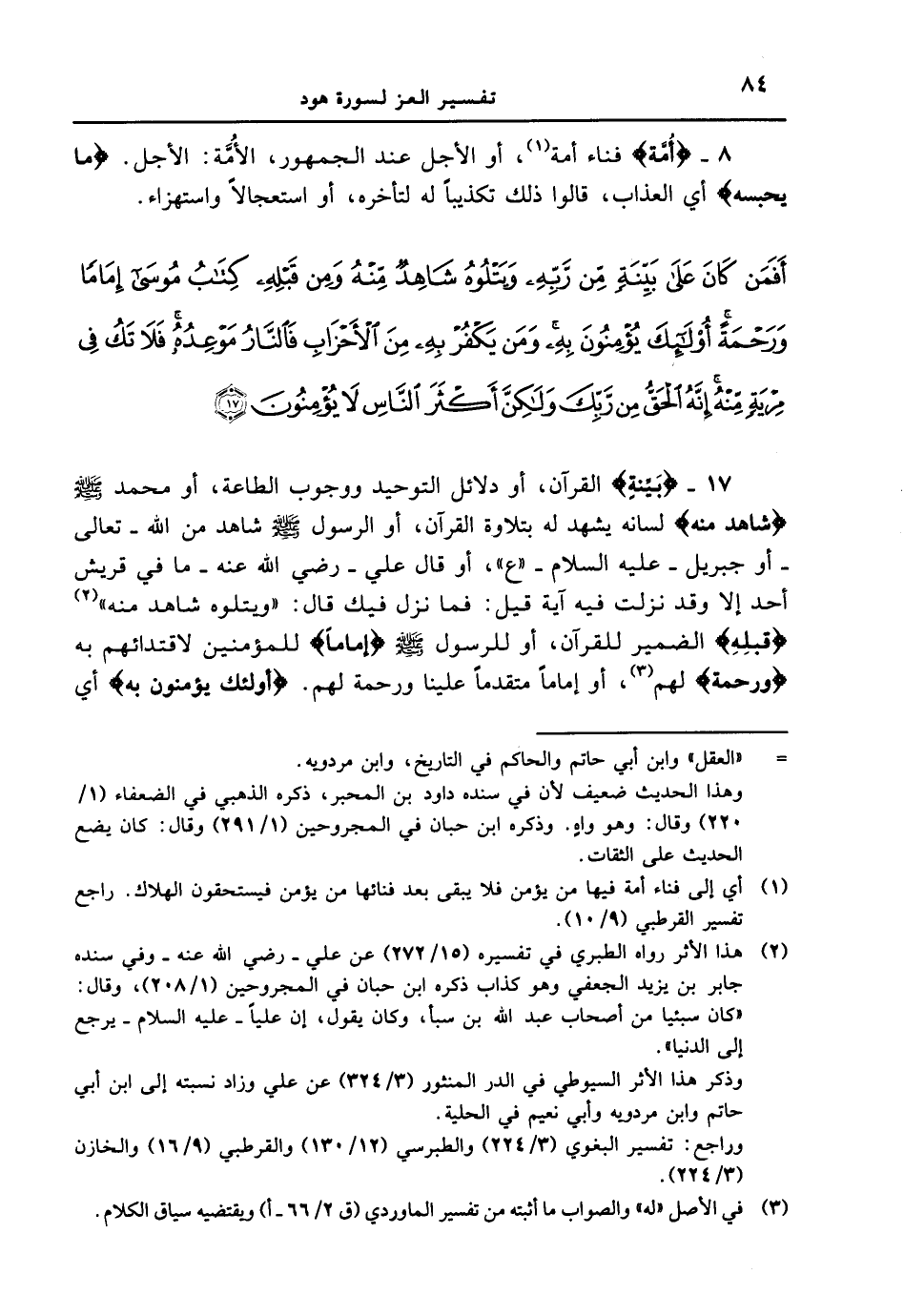 8 - {أُمَّةٍ} فناء أمة، أو الأجل عند الجمهور، الأُمَّة: الأجل. {مَا يَحْبِسُهُ} أي العذاب، قالوا ذلك تكذيباً له لتأخره، أو استعجالاً واستهزاء {أفمن كان على بينة من ربه ويتلوه شاهد منه ومن قبله كتاب موسى إماما ورحمة أولئك يؤمنون به ومن يكفر به من الأحزاب فالنار موعده فلا تك في مرية منه إنه الحق من ربك ولكن أكثر الناس لا يؤمنون}