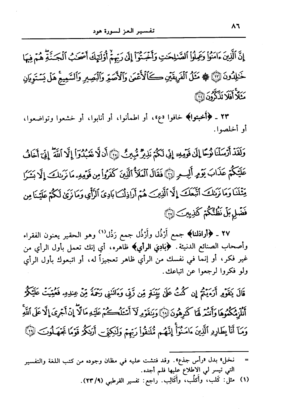 23 - {أخبتوا} خافوا " ع "، أو اطمأنوا، أو أنابوا، أو خشعوا وتواضعوا، أو أخلصوا. {ولقد أرسلنا نوحا إلى قومه إني لكم نذير مبين أن لا تعبدوا إلا الله إني أخاف عليكم عذاب يوم أليم فقال الملأ الذين كفروا من قومه ما نراك إلا بشرا مثلنا وما نراك اتبعك إلا الذين هم أراذلنا بادي الرأي وما نرى لكم علينا من فضل بل نظنكم كاذبين}