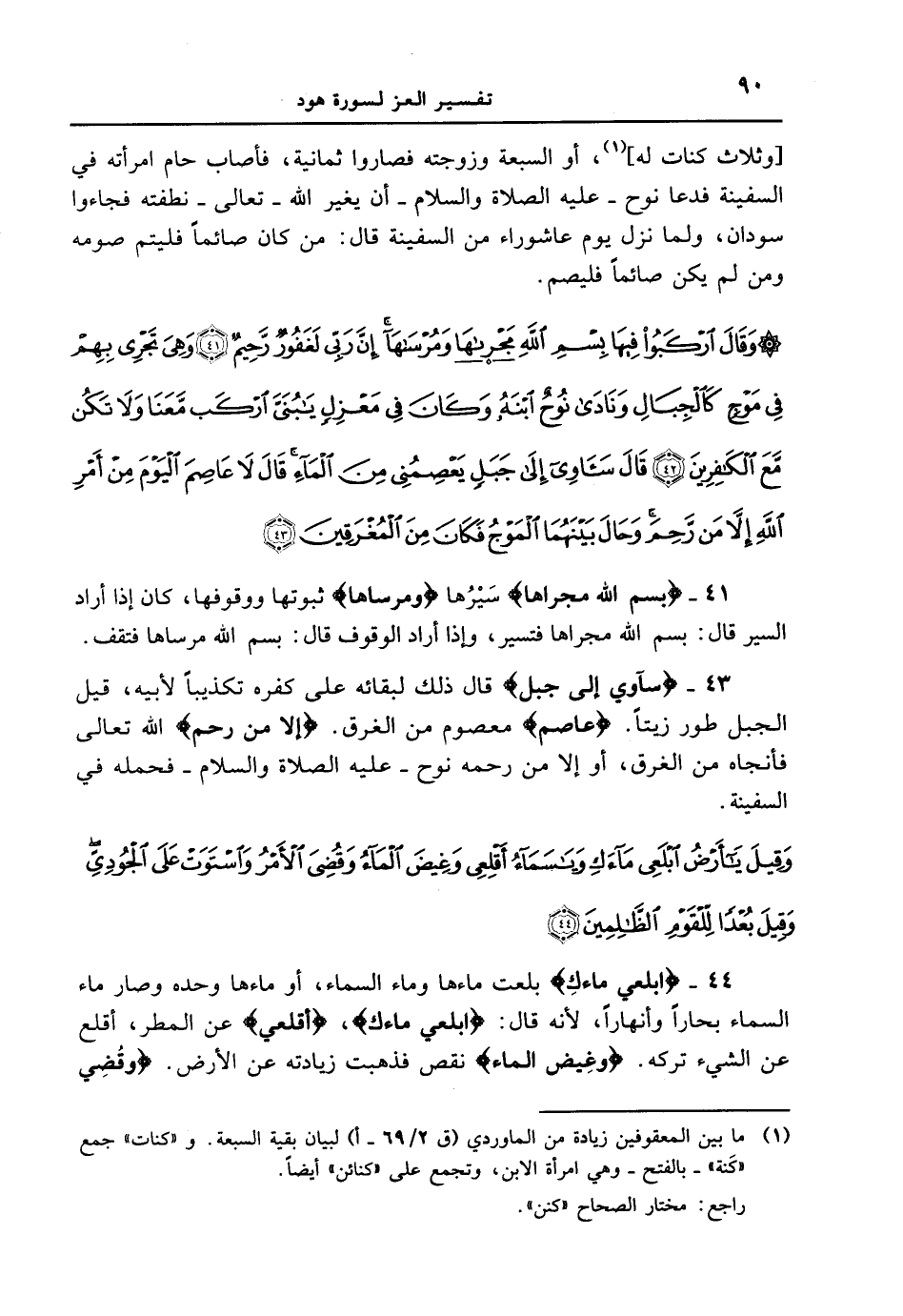 44 - {ابْلَعَى مَآءَكِ} بلعت ماءها وماء السماء، أو ماءها وحده وصار ماء السماء بحاراً وأنهاراً، لأنه قال: {ابْلَعِى مَآءَكِ) {} (أَقْلِعِى} عن المطر، أقلع عن الشي تركه. {وَغِيضَ الْمَآءُ} نقص فذهبت زيادته عن الأرض. {وقضي}