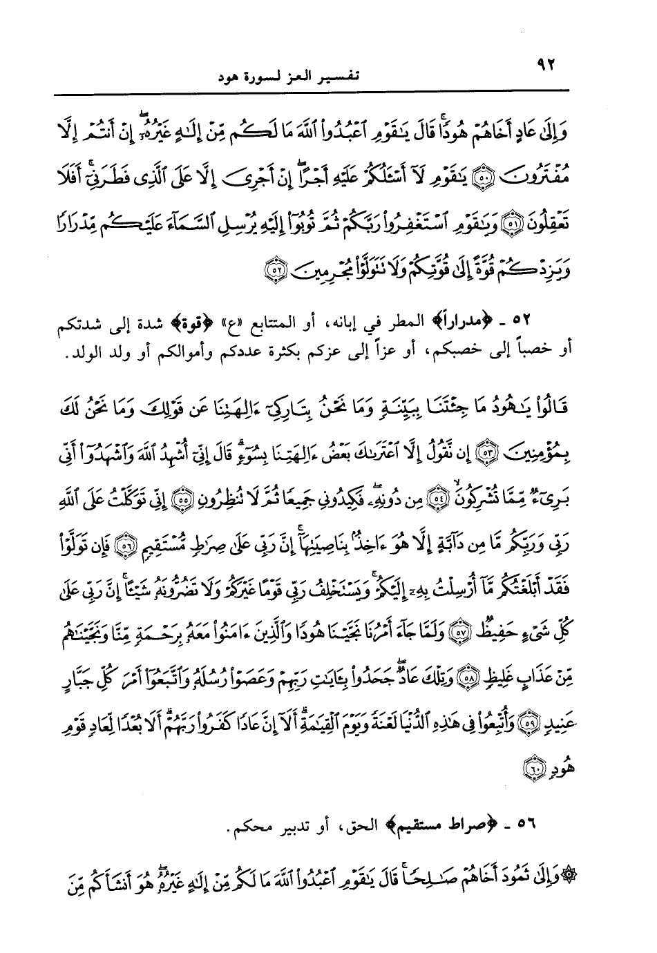 52 - {مِدْراراً} المطر في إبانه، أو المتتابع " ع " {قُوَّةً} شدة إلى شدتكم أو خصباً إلى خصبكم، أو غزأ إلى عزكم بكثرة عددكم وأموالكم أو ولد الولد. {قالوا يا يهود ما جئتنا ببينة وما نحن بتاركي ءالهتنا عن قولك وما نحن لك بمؤمنين إن نقول إلا اعتراك بعض ءالهتنا بسوء قال إني أشهد الله واشهدوا أني برئٌ مما تشركون من دونه فكيدوني جميعاً ثم لا تنظرون إني توكلت على الله ربي وربكم ما من دابة إلا هو ءاخذ بناصيتها إن ربي على صراط مستقيم فإن تولوا فقد أبلغتكم ما أرسلت به إليكم ويستخلف ربي قوماً غيركم ولا تضرونه شيئاً إن ربي على كل شيء حفيظ ولما جاء أمرنا نجيّنا هوداً والذين ءامنوا معه برحمةٍ منّا ونجيناهم من عذاب غليظ وتلك عادٌ جحدوا بئايات ربهم وعصوا رسله واتّبعوا أمر كل جبار عنيد وأتبعوا في هذه الدنيا لعنةً ويوم القيامة إلا أنّ عاداً كفروا ربهم إلا بعداً لعادٍ قومٍ هودٍ} \ 56 - {صراط مستقيم} الحق، أو تدبير محكم. {وإلى ثمود أخاهم صالحاً قال يا قوم اعبدوا الله مالكم من إله غيره هو أنشأكم من