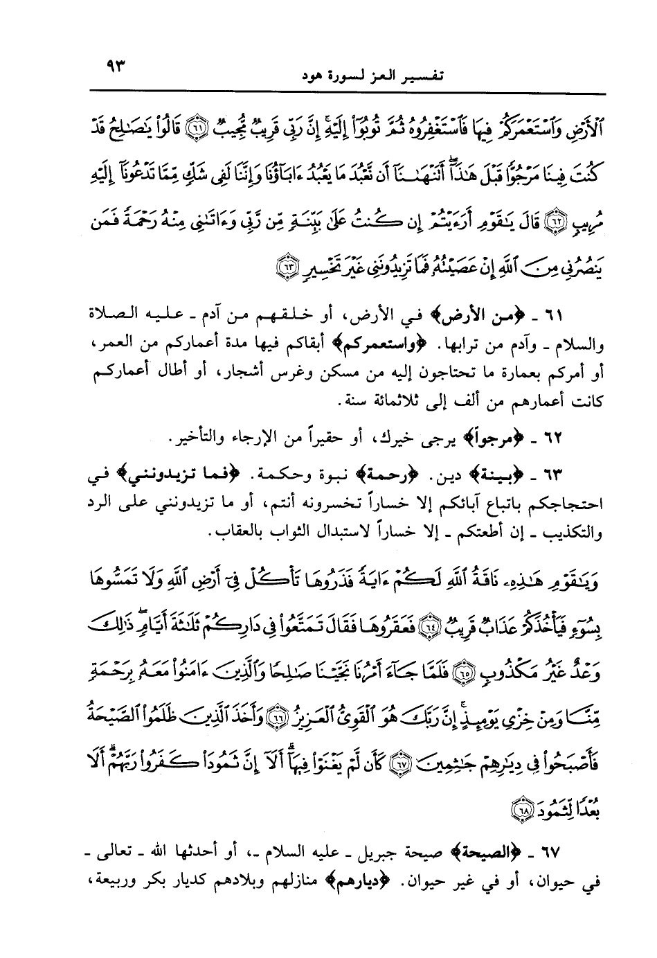 63 - {بَيِّنَةٍ) {دين} (رَحْمَةً} نبوة وحكمة. {فَمَا تَزِيدُونَنِى} في احتجاجكم باتباع آبائكم إلا خساراً تخسرونه أنتم، أو ما تزيدونني على الرد والتكذيب - إن أطعتكم - إلا خساراً لاستبدال الثواب بالعقاب. {ويا قوم هذه ناقة الله لكم ءاية فذروها تأكل في أرض الله ولا تمسّوها بسوء فيأخذكم عذاب قريب فعقروها فقال تمتعوا في داركم ثلاثة أيام ذلك وعد غير مكذوب فلما جاء أمرنا نجينا صالحاً والذين ءامنوا معه برحمةٍ منا ومن خزي يؤمئذٍ إن ربّك هو القوي العزيز وأخذ الذين ظلموا الصيحة فأصبحوا في ديارهم جاثمين كأن لم يغنوا فيها ألا إن ثمود كفروا ربهم ألا بعداً لثمود}