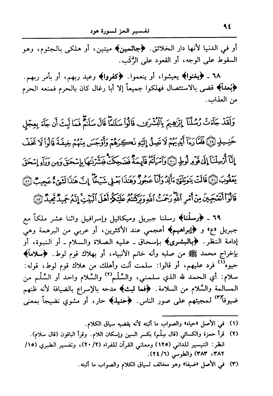 69 - {رُسُلُنَآ} رسلنا جبريل وميكائيل وإسرافيل واثنا عشر ملكاً مع جبريل " ع " و {إِبْرَاهِيمَ} أعجمي عند الأكثرين، أو عربي من البرهمة وهي إدامة النظر. {بالبشرى} بإسحاق - عليه الصلاة والسلام - أو النبوة، أو بإخراج محمد [صلى الله عليه وسلم] من صلبه وأنه خاتم الأنبياء، أو بهلاك قوم لوط. {سَلاماً} حيوه فرد عليهم، أو قالوا: سلمت أنت وأهلك من هلاك قوم لوط، قوله: سلام: أي الحمد لله الذي سلمني، والسِّلْم والسَّلام واحد أو السِّلْم من المسالمة والسَّلام من السلامة. {فَمَا لَبِثَ} مدحه بالإسراع بالضيافة لأنه ظنهم ضيوفاً لمجيئهم على صور الناس. {حَنِيذٍ} حار، أو مشوي نضيجاً بمعنى