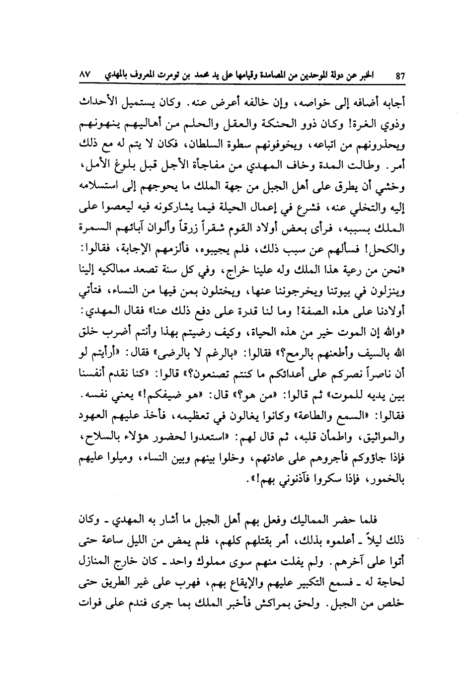 أَجَابَهُ أَضَافَهُ إِلَى خواصه وَإِن خَالفه أعرض عَنهُ وَكَانَ يستميل الْأَحْدَاث وَذَوي الْغرَّة وَكَانَ ذَوُو الحنكة وَالْعقل والحلم من أَهَالِيهمْ ينهونهم ويحذرونهم من اتِّبَاعه ويخوفونهم سطوة السُّلْطَان فَكَانَ لَا يتم لَهُ مَعَ ذَلِك أَمر وطالت الْمدَّة وَخَافَ الْمهْدي من مفاجأة الْأَجَل قبل بُلُوغ الأمل وخشي أَن يطْرق على أهل الْجَبَل من جِهَة الْملك مَا يحوجهم إِلَى استسلامه إِلَيْهِ والتخلي عَنهُ فشرع فِي إِعْمَال الْحِيلَة فِيمَا يشاركونه فِيهِ ليعصوا على الْملك بِسَبَبِهِ فَرَأى بعض أَوْلَاد الْقَوْم شقرا زرقا وألوان آبَائِهِم السمرَة والكحل فَسَأَلَهُمْ عَن سَبَب ذَلِك فَلم يُجِيبُوهُ فألزمهم الْإِجَابَة فَقَالُوا نَحن من رعية هَذَا الْملك وَله علينا خراج وَفِي كل سنة تصعد مماليكه إِلَيْنَا وينزلون فِي بُيُوتنَا ويخرجوننا عَنْهَا ويختلون بِمن فِيهَا من النِّسَاء فتأتي أَوْلَادنَا على هَذِه الصّفة وَمَا لنا قدرَة على دفع ذَلِك عَنَّا فَقَالَ الْمهْدي وَالله إِن الْمَوْت خير من هَذِه الْحَيَاة وَكَيف رَضِيتُمْ بِهَذَا وَأَنْتُم أضْرب خلق الله بِالسَّيْفِ وأطعنهم بِالرُّمْحِ فَقَالُوا بالرغم لَا بالرضى فَقَالَ أَرَأَيْتُم لَو أَن ناصرا نصركم على أعدائكم مَا كُنْتُم تَصْنَعُونَ قَالُوا كُنَّا نقدم أَنْفُسنَا بَين يَدَيْهِ للْمَوْت ثمَّ قَالُوا من هُوَ قَالَ هُوَ ضيفكم يَعْنِي نَفسه فَقَالُوا السّمع وَالطَّاعَة وَكَانُوا يغالون فِي تَعْظِيمه فَأخذ عَلَيْهِم العهود والمواثيق وَاطْمَأَنَّ قلبه ثمَّ قَالَ لَهُم اسْتَعدوا لحضور هَؤُلَاءِ بِالسِّلَاحِ فَإِذا جاؤوكم فأجروهم على عَادَتهم وخلوا بَينهم وَبَين النِّسَاء وميلوا عَلَيْهِم بالخمور فَإِذا سَكِرُوا فآذنوني بهم