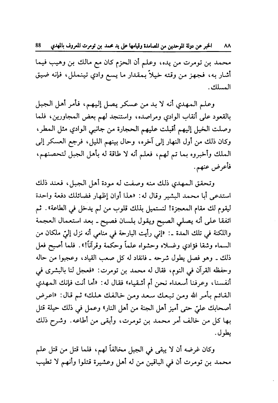 مُحَمَّد بن تومرت من يَده وَعلم أَن الحزم كَانَ مَعَ مَالك بن وهيب فِيمَا أَشَارَ بِهِ فَجهز من وقته خيلا بِمِقْدَار مَا يسع وَادي تينملل فَإِنَّهُ ضيق المسلك