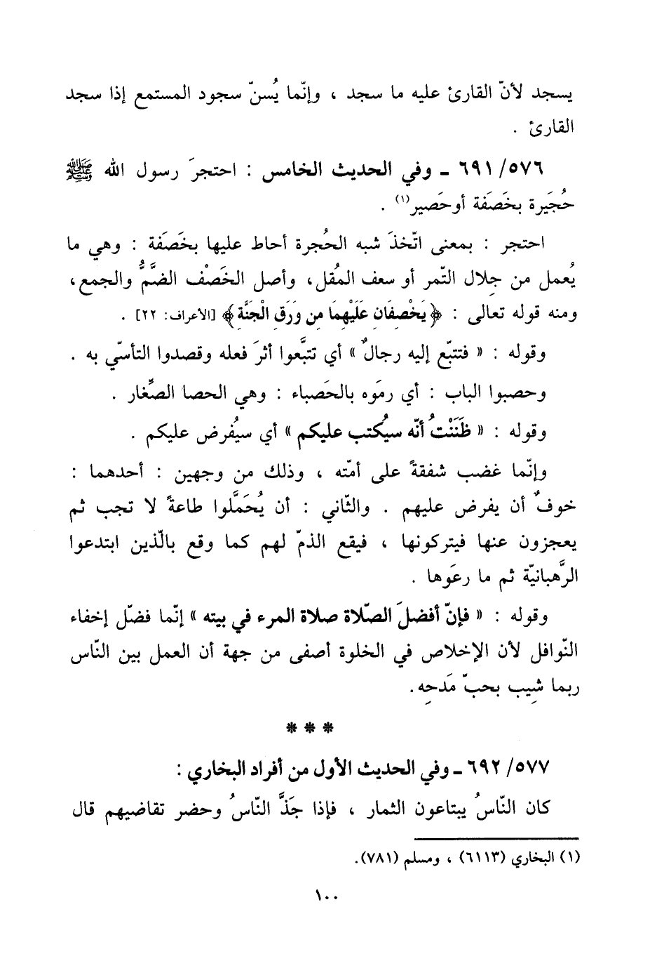 576 - / 691 - وَفِي الحَدِيث الْخَامِس: احتجر رَسُول الله صلى الله عَلَيْهِ وَسلم حجيرة بخصفة أوحصير. [15] احتجر: بِمَعْنى اتخذ شبه الْحُجْرَة أحَاط عَلَيْهَا بخصفة: وَهِي مَا يعْمل من جلال التَّمْر أَو سعف الْمقل، وأصل الخصف الضَّم وَالْجمع، وَمِنْه قَوْله تَعَالَى: {يخصفان عَلَيْهِمَا من ورق الْجنَّة} [الْأَعْرَاف: 22] . [15] وَقَوله: " فتتبع إِلَيْهِ رجال " أَي تتبعوا أثر فعله وقصدوا التأسي بِهِ. [15] وحصبوا الْبَاب: أَي رَمَوْهُ بالحصباء: وَهِي الْحَصَا الصغار. [15] وَقَوله: " ظَنَنْت أَنه سيكتب عَلَيْكُم " أَي سيفرض عَلَيْكُم. [15] وَإِنَّمَا غضب شَفَقَة على أمته، وَذَلِكَ من وَجْهَيْن: أَحدهمَا: خوف أَن يفْرض عَلَيْهِم. وَالثَّانِي: أَن يحملوا طَاعَة لَا تجب ثمَّ يعجزون عَنْهَا فيتركونها، فَيَقَع الذَّم لَهُم كَمَا وَقع بالذين ابتدعوا الرهبانية ثمَّ مَا رعوها. [15] وَقَوله: " فَإِن أفضل الصَّلَاة صَلَاة الْمَرْء فِي بَيته " إِنَّمَا فضل إخفاء النَّوَافِل لِأَن الْإِخْلَاص فِي الْخلْوَة أصفى من جِهَة أَن الْعَمَل بَين النَّاس رُبمَا شيب بحب مدحه.