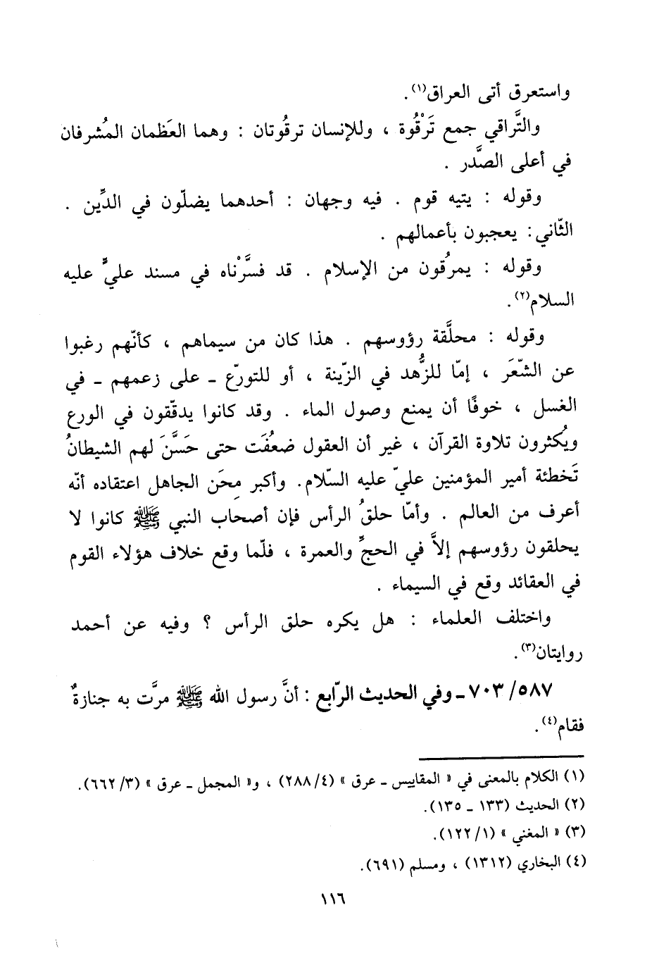 واستعرق أَتَى الْعرَاق. [15] والتراقي جمع ترقوة وللإنسان ترقوتان: وهما العظمان المشرفان فِي أَعلَى الصَّدْر. [15] وَقَوله: يتيه قوم. فِيهِ وَجْهَان: أَحدهمَا يضلون فِي الدّين. الثَّانِي: يعْجبُونَ بأعمالهم. [15] وَقَوله: يَمْرُقُونَ من الْإِسْلَام. قد فسرناه فِي مُسْند عَليّ عَلَيْهِ السَّلَام. [15] وَقَوله: محلقة رؤوسهم. هَذَا كَانَ من سِيمَاهُمْ، كَأَنَّهُمْ رَغِبُوا عَن الشّعْر، إِمَّا للزهد فِي الزِّينَة، أَو للتورع على زعمهم فِي الْغسْل، خوفًا أَن يمْنَع وُصُول المَاء. وَقد كَانُوا يدققون فِي الْوَرع ويكثرون تِلَاوَة الْقُرْآن، غير أَن الْعُقُول ضعفت حَتَّى حسن لَهُم الشَّيْطَان تخطئة أَمِير الْمُؤمنِينَ عَليّ عَلَيْهِ السَّلَام. وأكبر محن الْجَاهِل اعْتِقَاده أَنه أعرف من الْعَالم. وَأما حلق الرَّأْس فَإِن أَصْحَاب النَّبِي صلى الله عَلَيْهِ وَسلم كَانُوا لَا يحلقون رؤوسهم إِلَّا فِي الْحَج وَالْعمْرَة، فَلَمَّا وَقع خلاف هَؤُلَاءِ الْقَوْم فِي العقائد وَقع فِي السيماء.